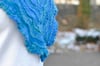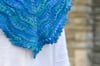 The small and large versions of the shawl are shown in Malabrigo Sock in Aguas (small) and Cote d’ Azure (large). The medium version of the shawl is shown in Malabrigo Lace in Emerald Blue.