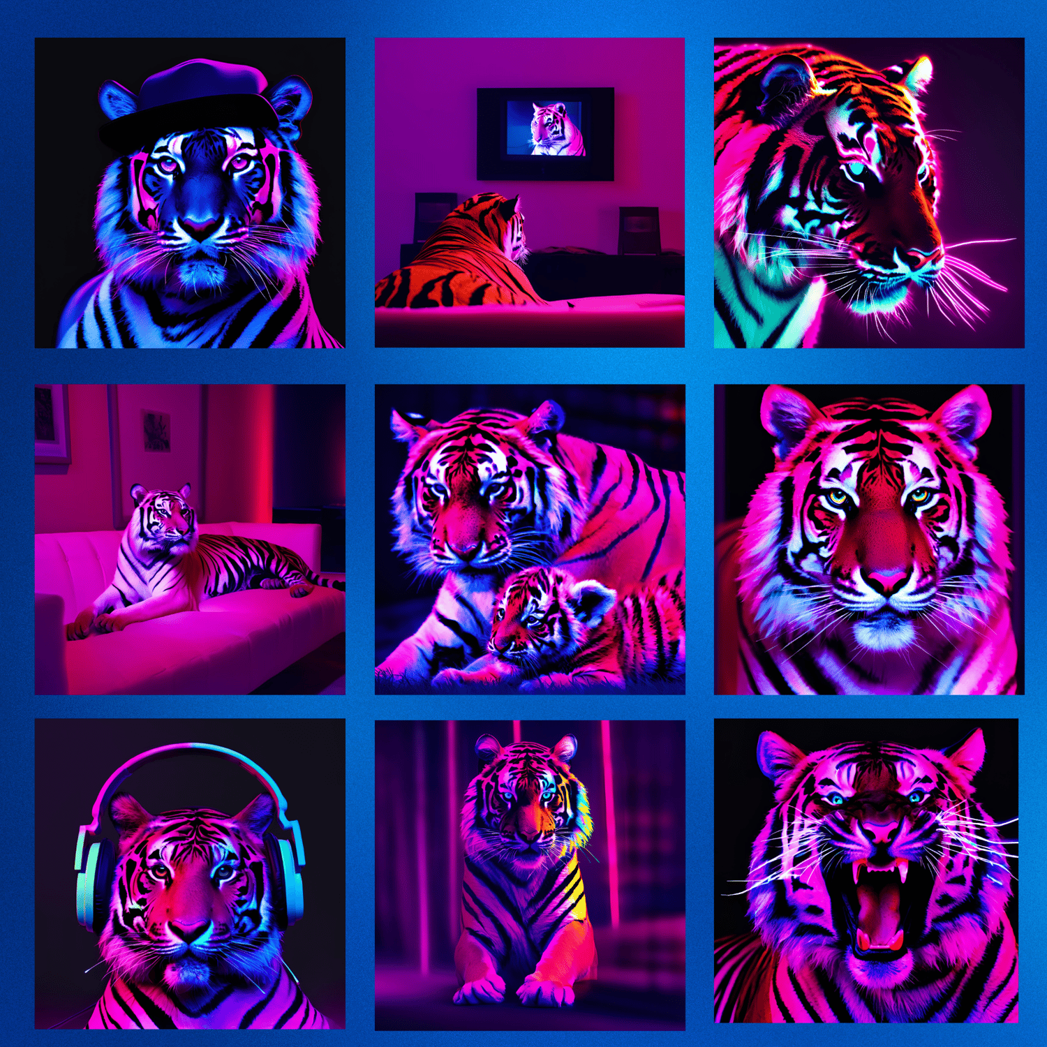 By incorporating these AI-generated neon tiger images into your room, you not only enhance the aesthetic appeal but also create an atmosphere that is both modern and timeless. The high resolution ensures that the intricate details of the tigers' fur and the vibrant play of neon lights are captured exquisitely, making each piece a mesmerizing focal point. Transform your space into a gallery of contemporary art that celebrates the majesty of tigers and the captivating allure of neon, bringing a unique and personalized touch to your environment.
