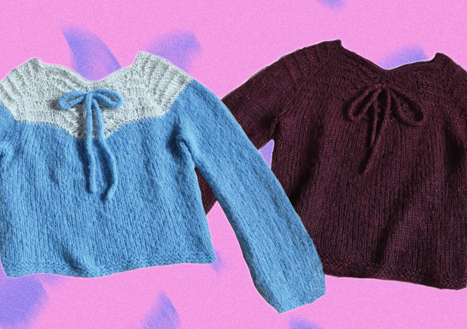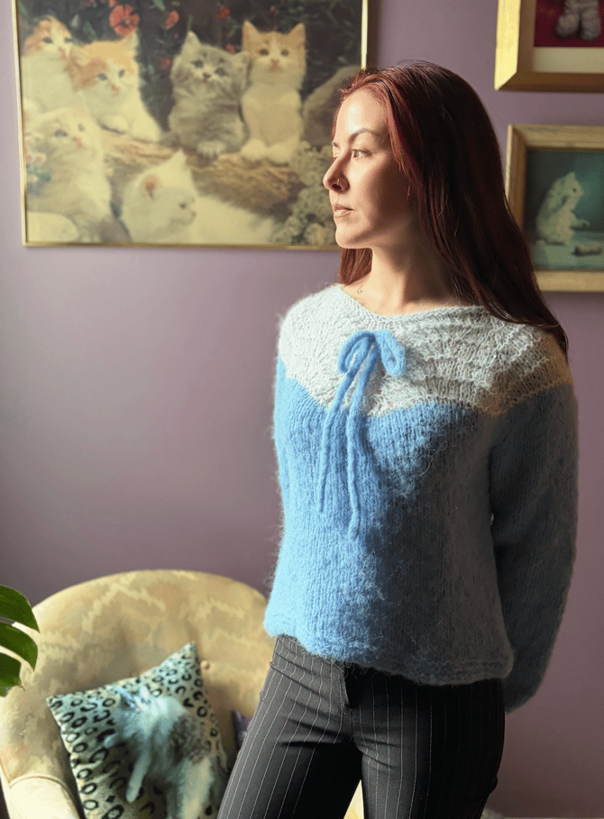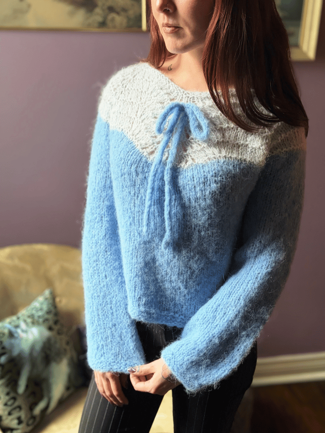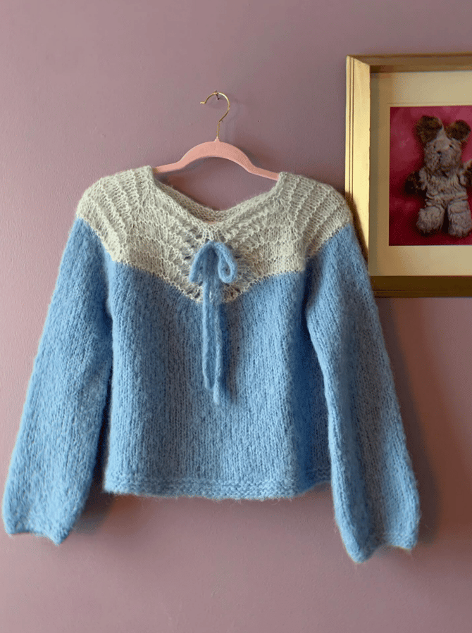 The lace pattern centred on the front and back of the raglan yoke, naturally shapes the neckline giving it a subtle sweetheart shape, and an optional i-cord bow is the finishing touch for this effortless fluffy sweater.