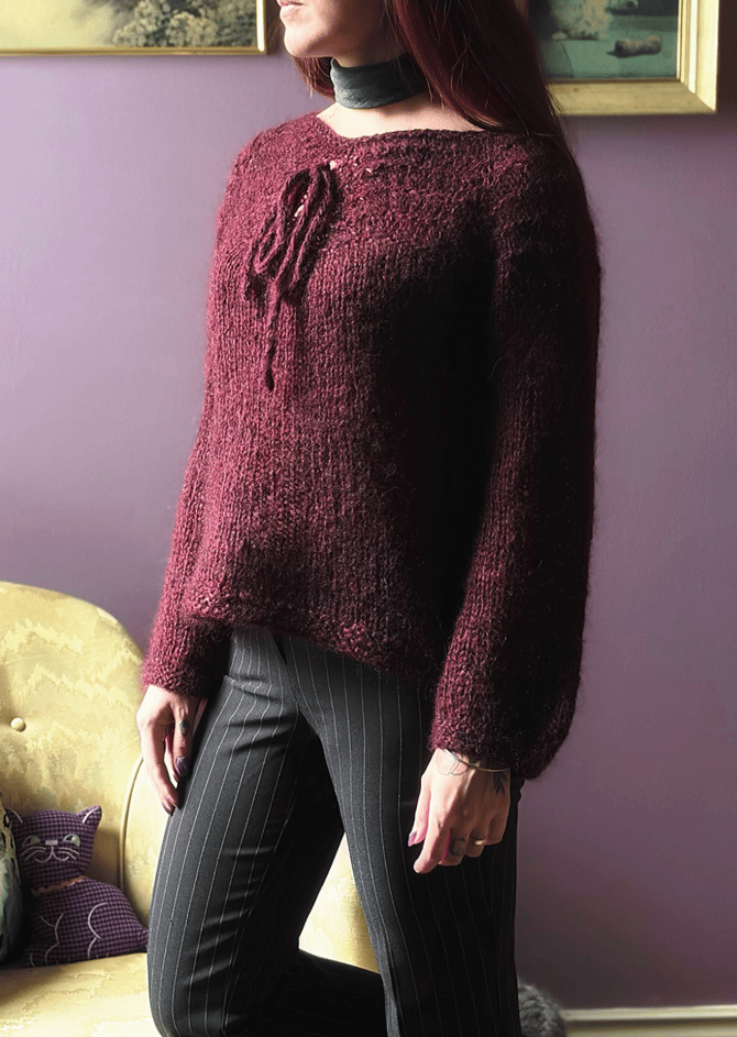 A loosely knit sweater in a fluffy yarn, makes for an airy and light sweater that still maintains warmth and coziness <3