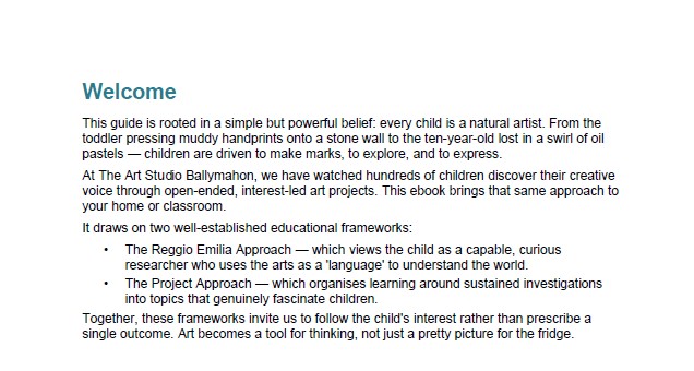 This guide was written by the founder of The Art Studio Ballymahon in Co. Longford, Ireland — a working children's art studio where kids aged 4–14 explore art every Saturday. Everything in these pages has been tried, tested, and loved by real children.
