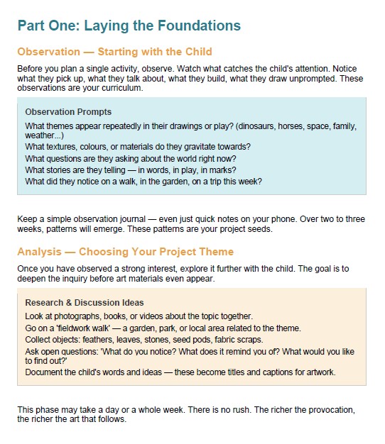 ✦ The Observation-Research-Analysis sequence — how to follow a child's interest and turn it into a rich art project