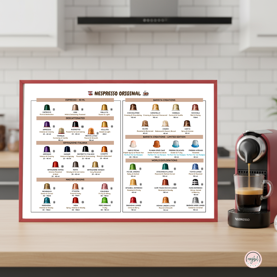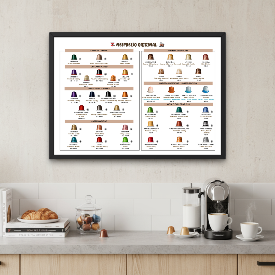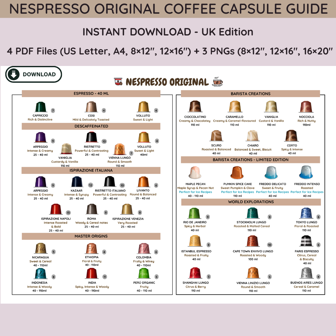 Printable Nespresso Original Coffee Capsule Guide (UK Edition) – Updated November 2025 – Intensity & Flavour Chart, Coffee Corner Decor