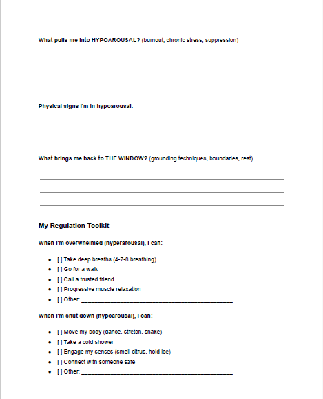 Emotion Regulation Journal Prompts: Guided reflections on self-compassion, safety affirmations, and trauma processing to release stored tension and celebrate small wins.