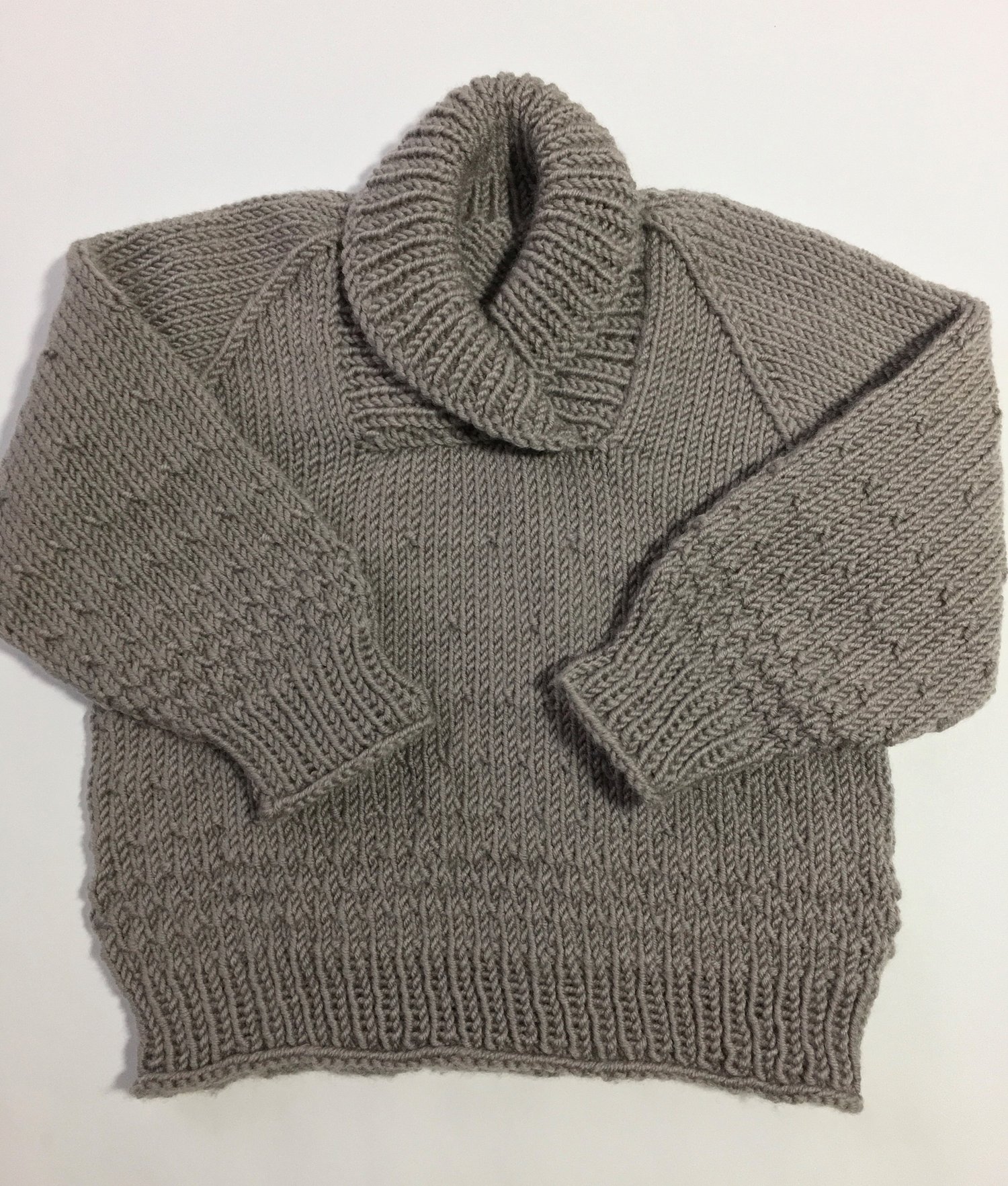 Wombat is a cute little jumper (pullover) with a cuddly shawl collar. It features a gentle, textured gradient pattern, rolled edges and strong raglan lines.