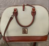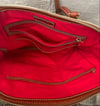 Ivory/cream color with medium brown handles and shoulder strap. Red fabric interior with zipper pouch and additional pockets.