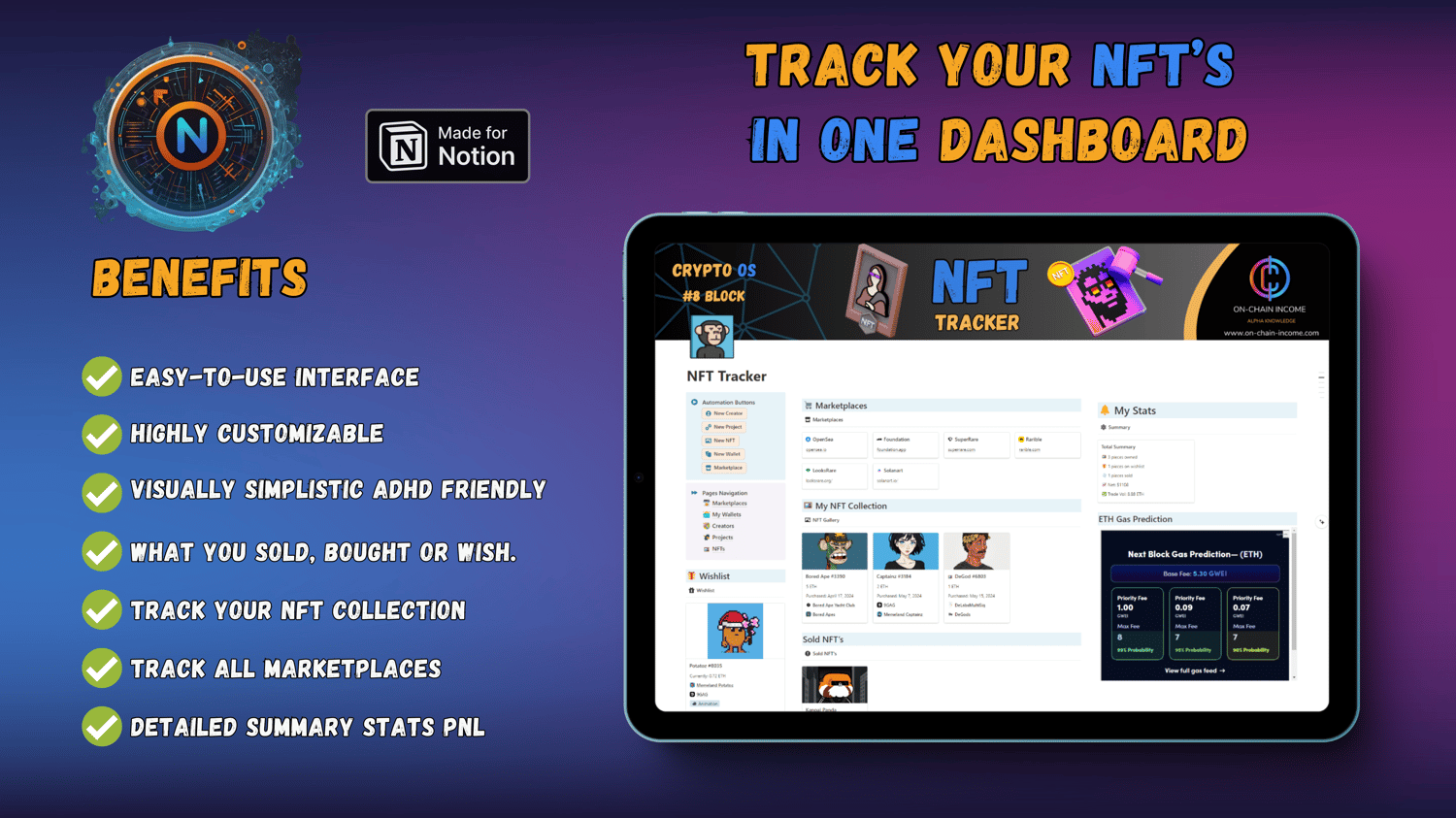 Are you an NFT collector, crypto enthusiast, or digital entrepreneur looking to stay on top of your NFT investments? Our Notion NFT Tracker Template is designed just for you! This sleek and user-friendly template offers everything you need to track your NFT collections, and stay ahead in the dynamic world of digital art!