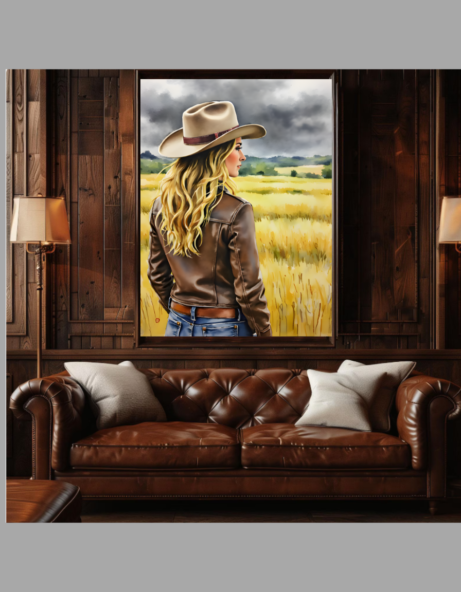 Elevate your space with this stunning Blonde Cowgirl Wall Art Digital Download, a high-resolution PNG 300dpi file perfect for printable wall art and western decor. Featuring a beautiful blonde cowgirl in a classic cowboy hat, brown leather jacket, and jeans, gazing over a golden wheat field under dramatic stormy skies, this rustic cowgirl painting captures the essence of trendy western art and coastal cowgirl aesthetic.