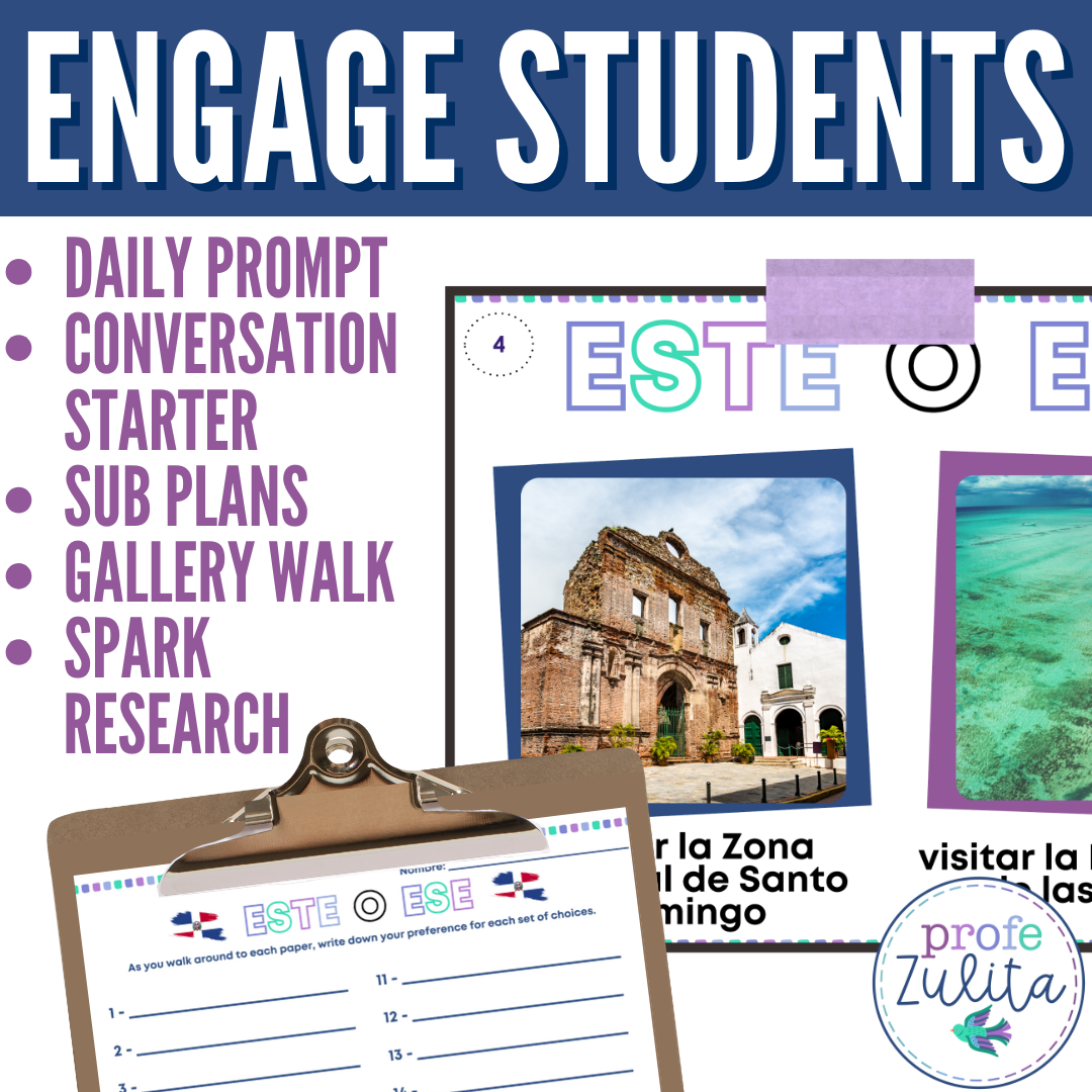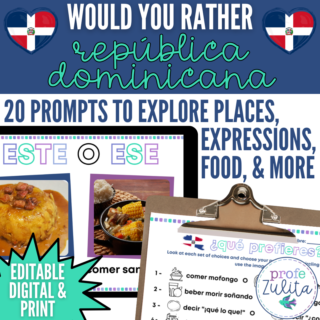 Your students will be engaged with this fun Este o Ese game as they learn about La República Dominicana in Spanish. These 20 prompts include topics like food, drinks, travel destinations, animals, & more! These prompts will engage students as warm-up activities, game days, conversation starters, gallery walk, sub plans & more. This would you rather game is digital on Google Slides, includes a printable gallery walk with note catcher, & printable PDF worksheet version.