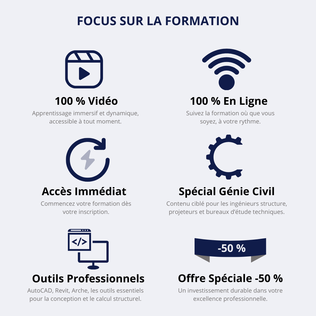 La formation BET&BIM est destinée aux ingénieurs des bureaux d’études techniques souhaitant renforcer leurs compétences en conception, modélisation et dimensionnement des structures de bâtiment en béton armé. Elle permet d’approfondir la maîtrise des normes et réglementations propres au génie civil, de développer l’usage du BIM avec Revit pour une gestion intégrée et efficace des projets, et d’apprendre la DAO avec AutoCAD afin de produire des plans techniques précis et professionnels, tout en valorisant son profil dans un secteur en constante évolution.