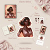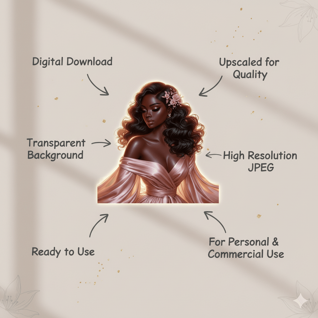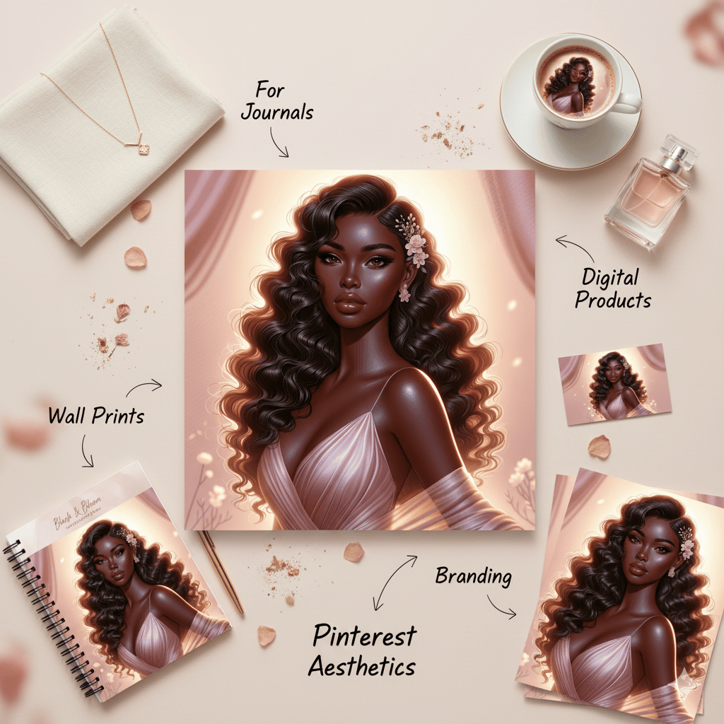 Each illustration features a graceful Black woman in soft tones, designed to add warmth, style, and personality to your designs — whether you’re creating journals, planners, Pinterest pins, brand mockups, or digital prints.