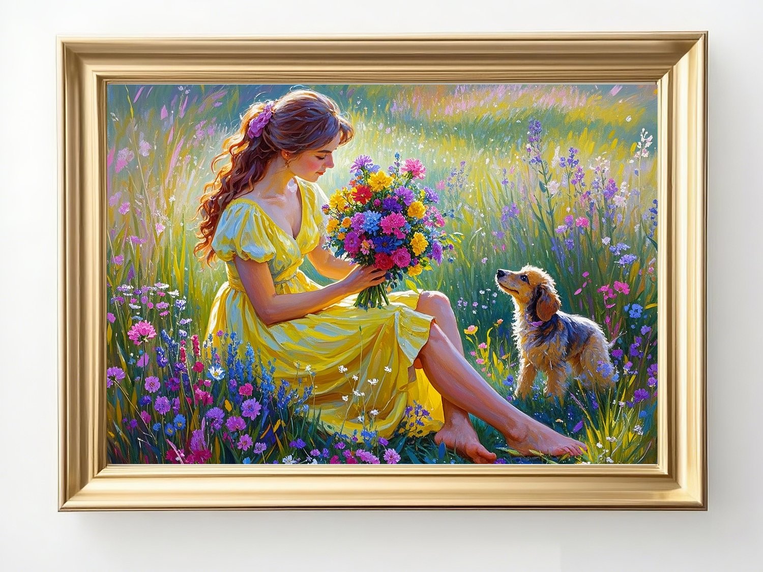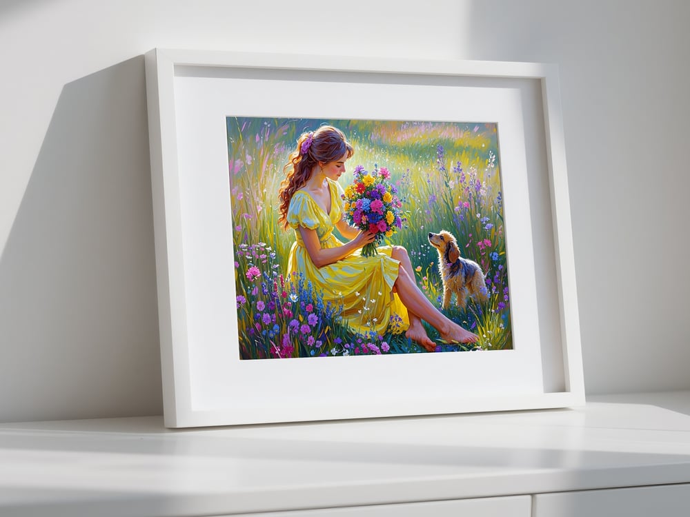This digital artwork captures a tender moment between a girl and her puppy surrounded by wildflowers under the warm sunlight. With its soothing colors and poetic composition, it’s perfect for bedrooms, living rooms, or wellness spaces.