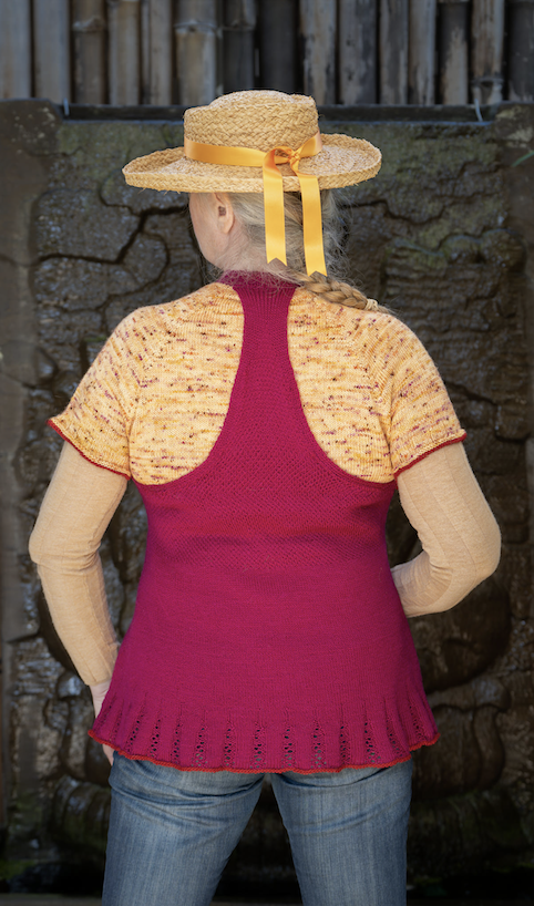 A double layer vest using fingering weight yarn, one layer is knit bottom up with a decorative hem, racer back and halter neck; the other layer is knit top-down with raglan short sleeves. Layers are joined at the underarm and neck.