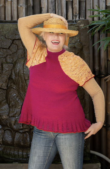 This slipover vest is suited to many body shapes including lollipop, column, pear and apple silhouettes. You could even do a maternity version. If you have broad shoulders, you can use a darker colour across the shoulders and lighter colour for the halter neck drawing the focus towards the centre. It’s an ideal way to feature a couple of skeins of hand dyed or hand painted yarn with a less expensive option as the outer layer.