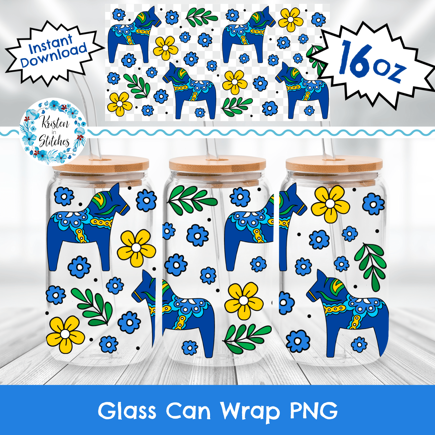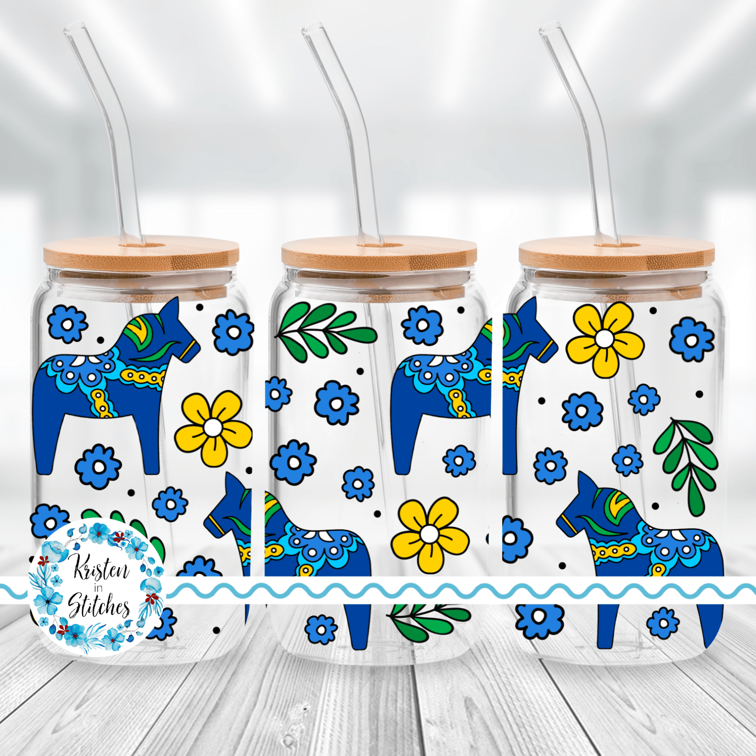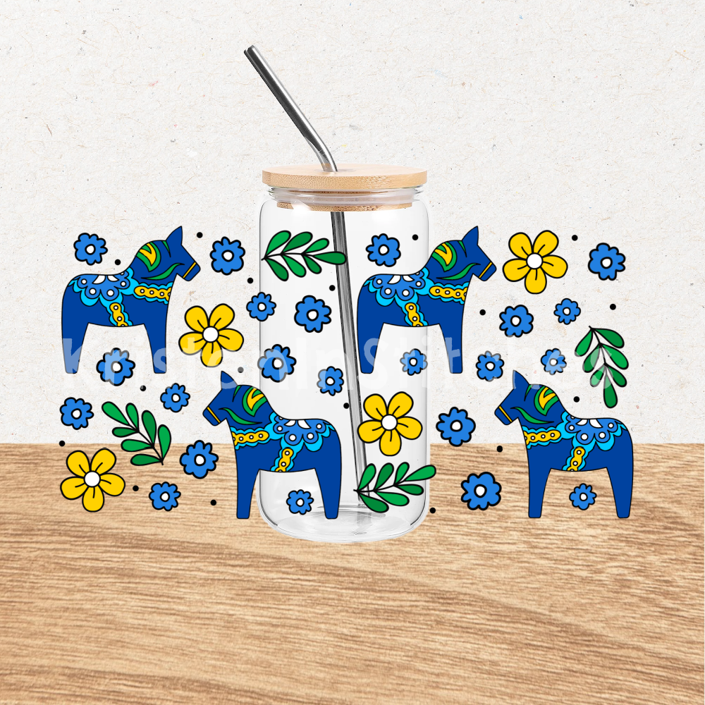 Blue Dala Horses Folk Floral Glass Can Wrap Transparent PNG