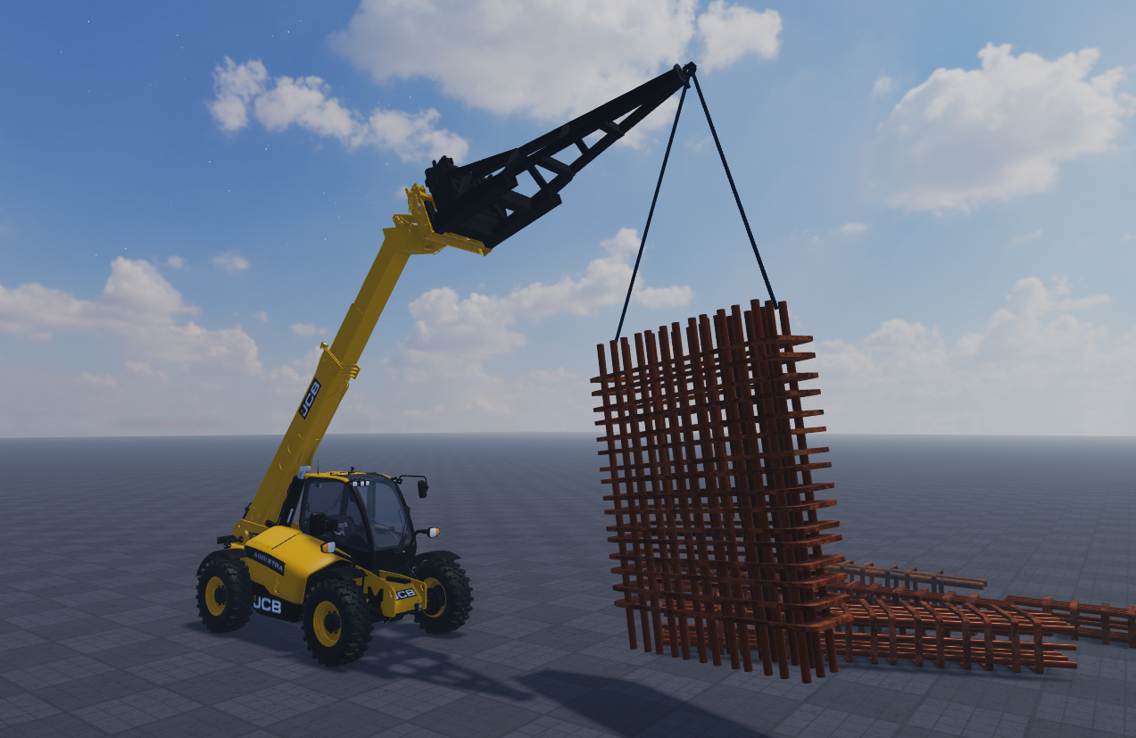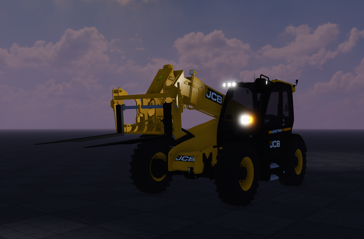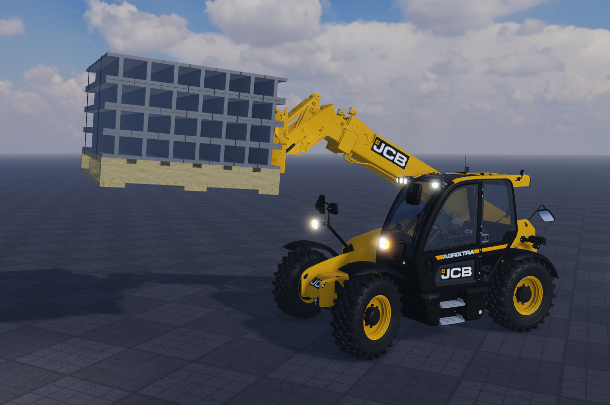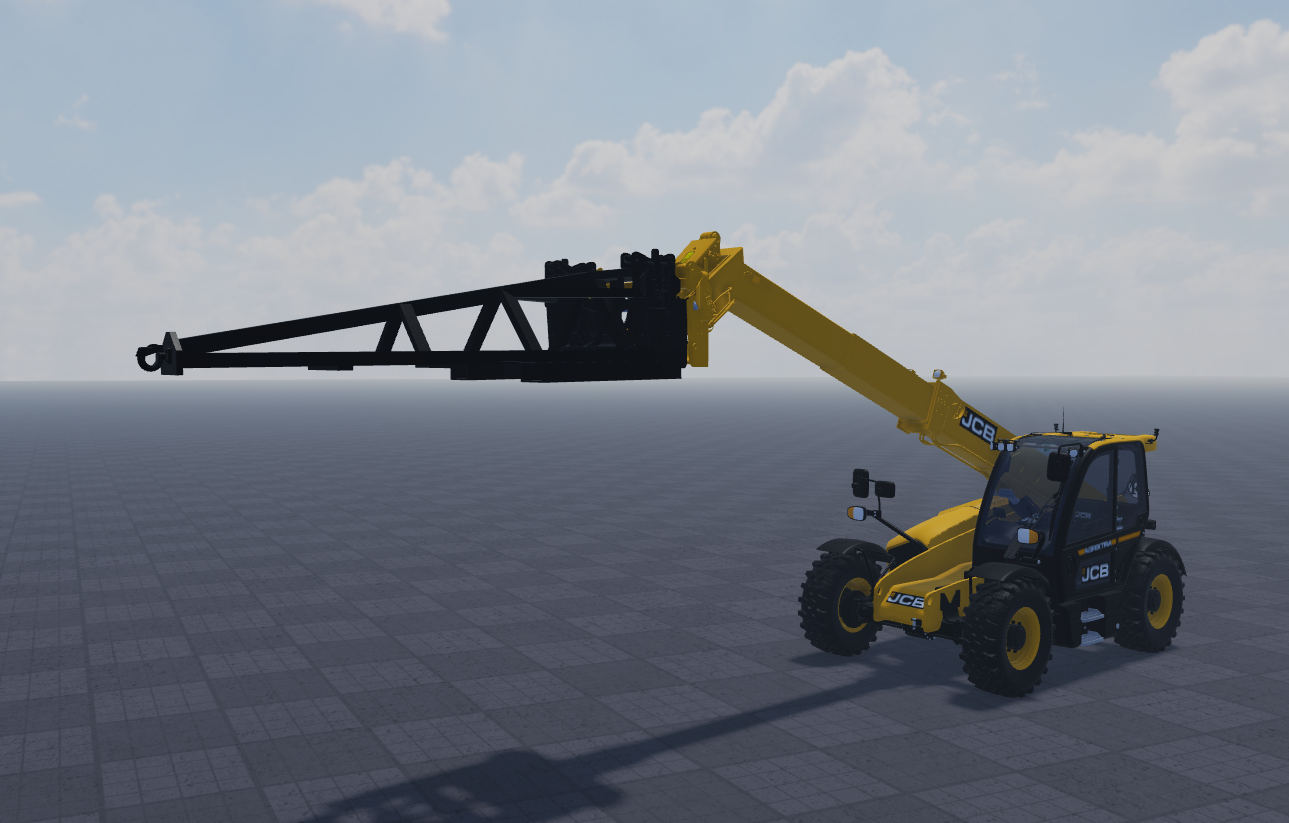 If you used my skytrak and JLG, this should be a piece of cake. This model comes with a jib attachment with winches you can use to lift object. Please **PLEASE** click the jib first when you are going to lift it. Its a WIP system so it may not be all the way perfect. On the very side of the Jib theres a clicker to open the winches. I RECOMMEND, click the pallet TWICE to get network ownership to register, that way you can pick up ALL the other pallets WITHOUT clicking.