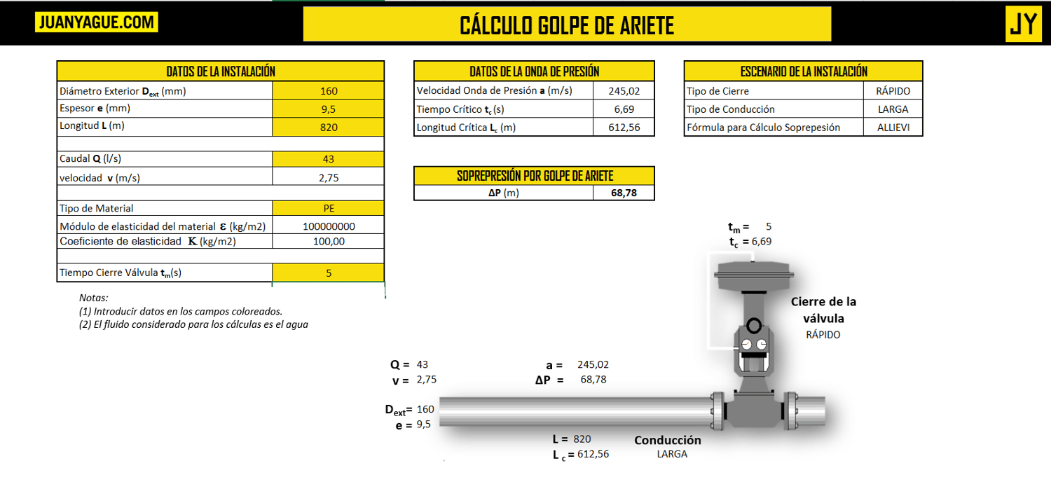 Para que no tengas que perder el tiempo abriendo la calculadora se incluye una hoja de Excel en la que podrás "jugar" con los datos y ver como los diferentes parámetros del sistema, como la velocidad del fluido, su material, la longitud de la conducción, etc., determinan cómo se producirá el golpe de ariete.