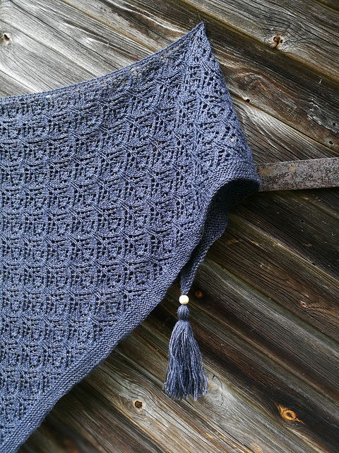 Around the corner is a traditional triangle shawl worked from top center towards Outer edge. The other shawl side is worked with garter stitch, and the other is decorated with lace pattern resembling the French balconies.