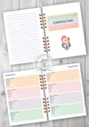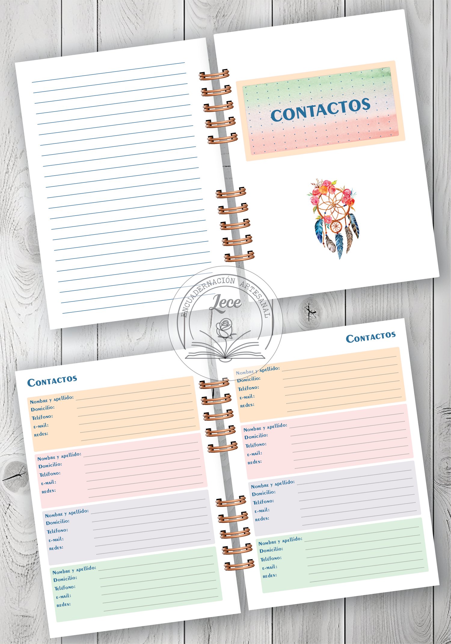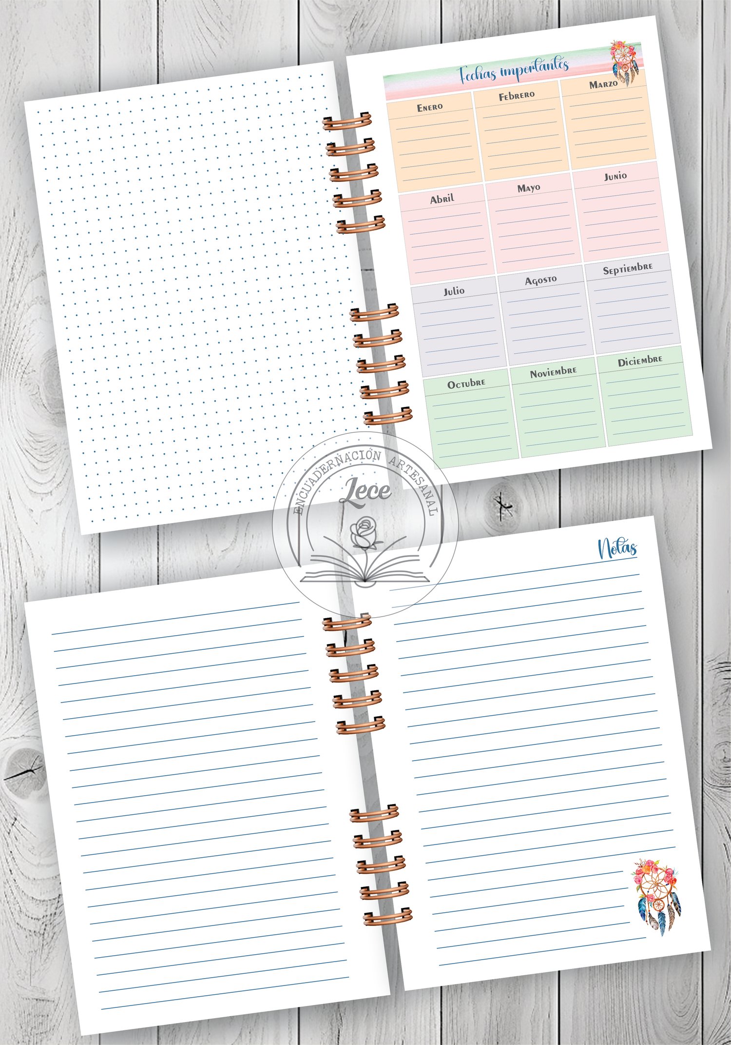- 1 modelo de interior de agenda y sus variantes para imprimir en tamaño A5 para anillado y costura