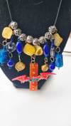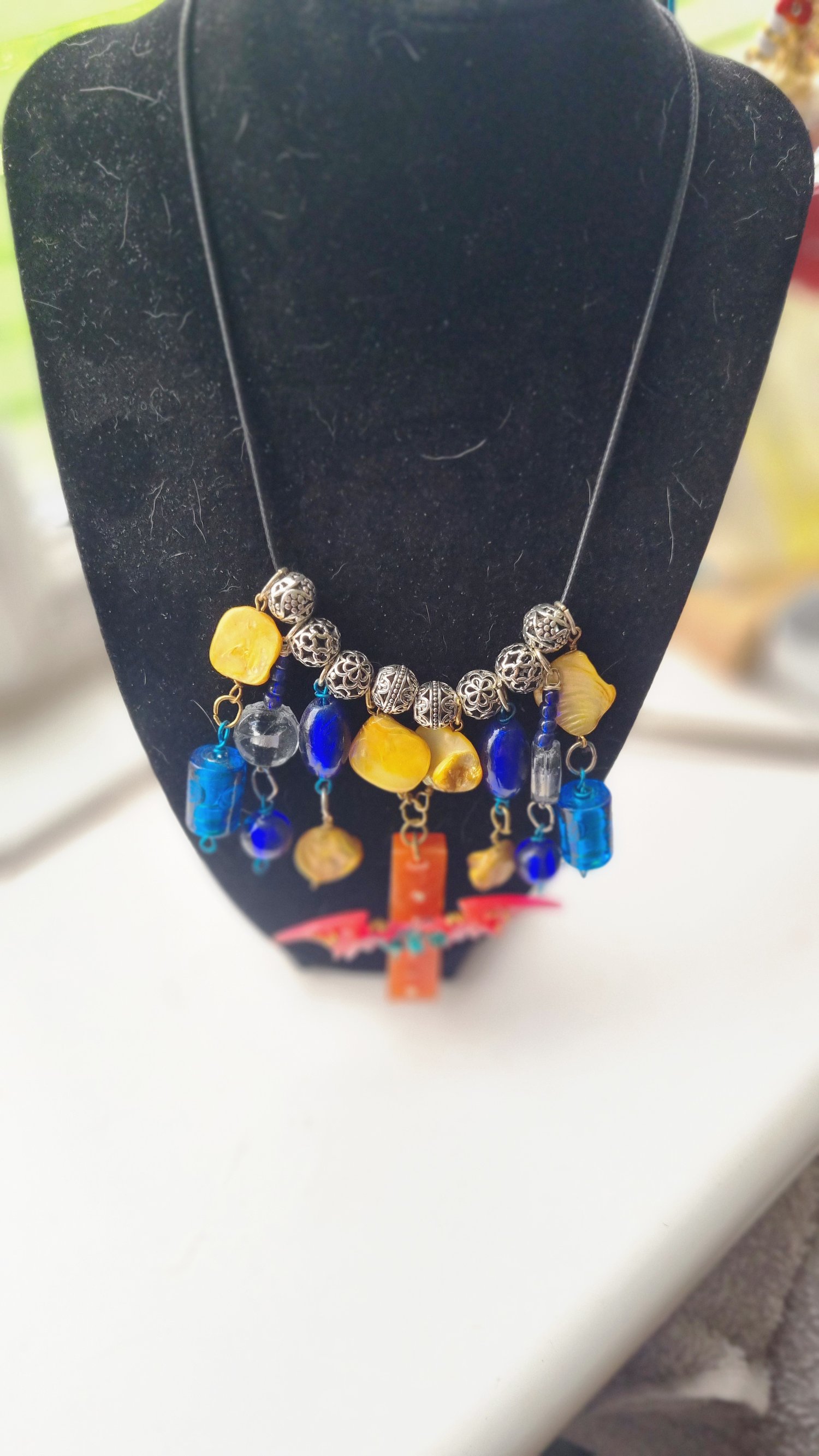 Crafted on sturdy synthetic rope, this piece balances grit and grace like only a true monarch of the night can. The golden wheel-style beads bring a regal gleam, circling like sunbursts frozen at midnight—complimenting the stormy elegance of deep blue rose glass beads that bloom with mysterious beauty.