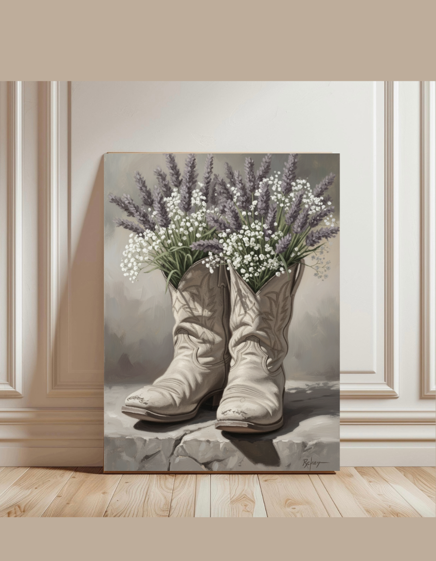 Crafted in a soft, dreamy palette of purple lavender and white blooms against neutral tones, this floral boots design captures the essence of cottagecore art and western decor. Whether you're decorating a cozy bedroom, farmhouse kitchen, or creative studio, this printable PNG offers endless versatility—print it as large posters, canvas wraps, or framed wall decor to infuse your surroundings with flower decor magic and rustic print elegance.