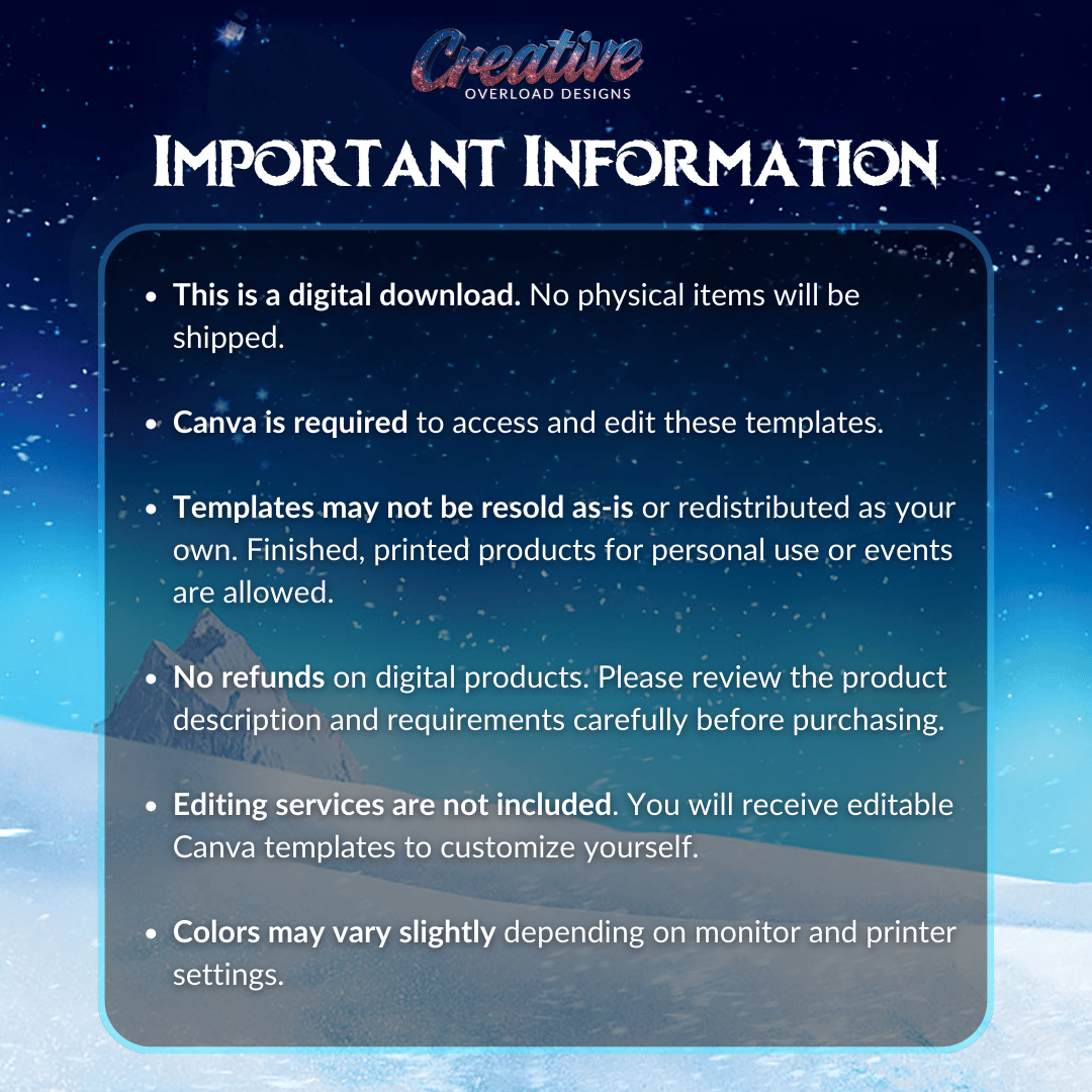 Templates may not be resold as-is or redistributed as your own. Finished, printed products for personal use or events are allowed.
