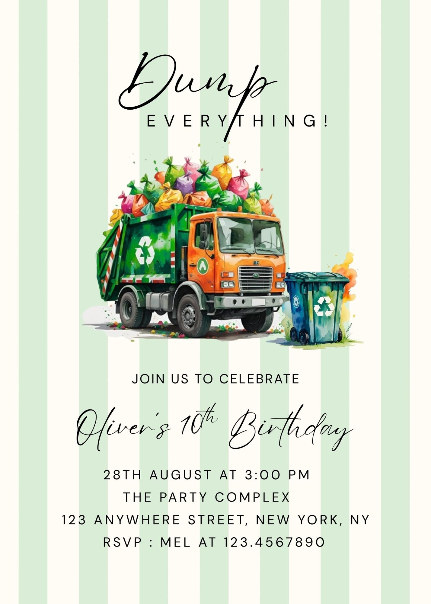 Trash Truck Invitation, Dump Everything Invite, Garbage Truck Invite, Green Dump Truck Birthday Invite, Any Age Boy Girl Birthday Invitation