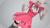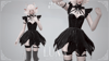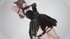 A shiny latex frilly dress with a ruffled neckpiece and a big cross.
