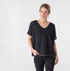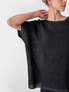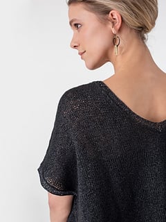 ELAN - a reversible, semi-sheer, oversized pullover in Vine. Elan is worked in the round from the bottom up, then divided at the armholes and worked flat to the shoulders. Trimmed at the hem, neck, and armholes in Twig, you have your choice of style and can wear either the crew neck or the V-neck in front.