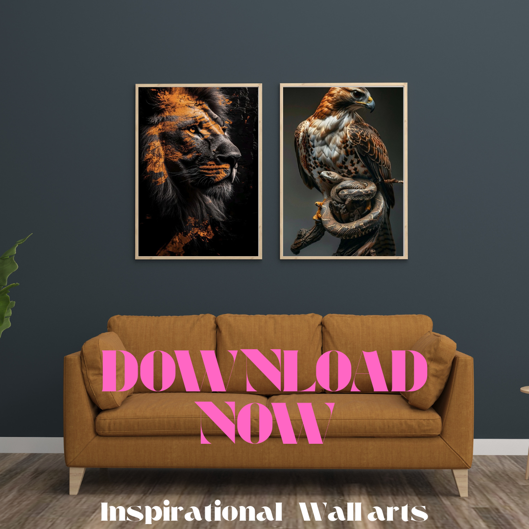 Transform your space with this stunning duo of digital wall art, featuring a powerful lion and a majestic hawk with a serpent—symbols of strength, courage, and precision.