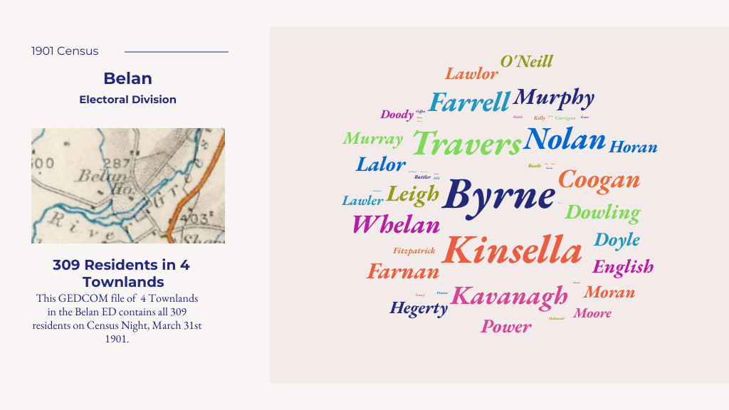 - There were 309 people resident in the Belan Electoral Division on Census Night March 31st 1901. The 4 townlands included in this file, with their populations, are as follows: