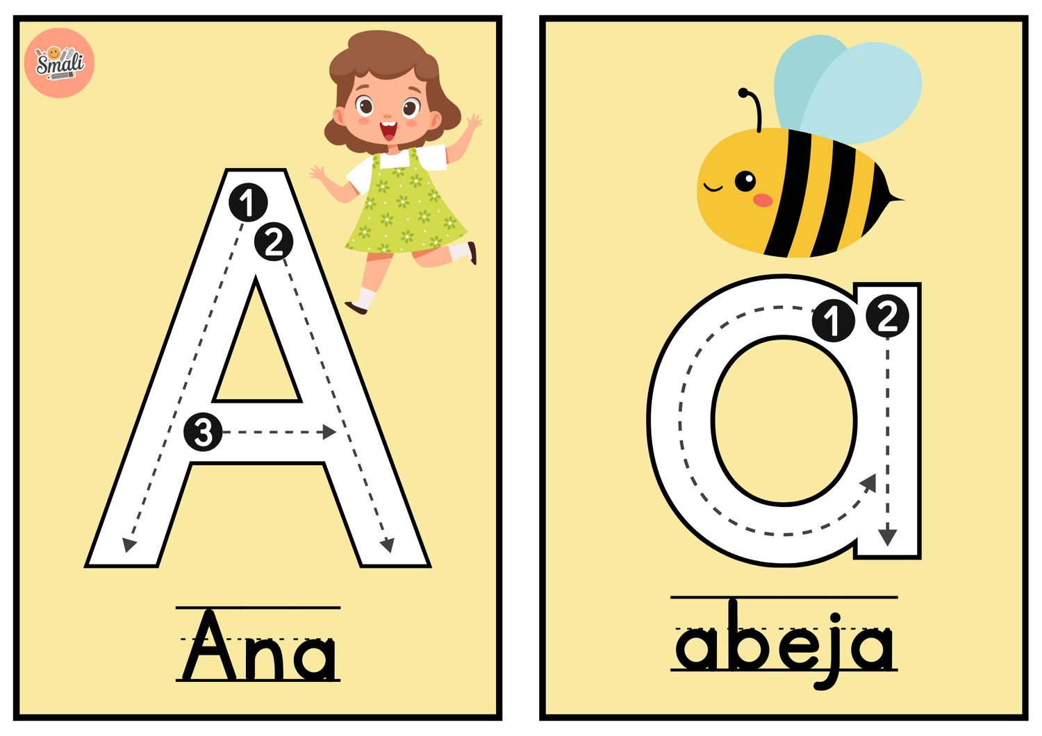 Abecedario ilustrado, con indicador de escritura, uso de mayúsculas y minúsculas.