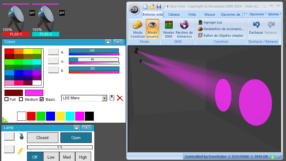 Esta Librería SSL2 está optimizada para trabajar con Magic 3d Easy View. Es decir para ver una representación 3D de las secuencias que estemos realizando con Freestyler, QLC+ o cualquier otro soft que se conecte con Magic 3d.