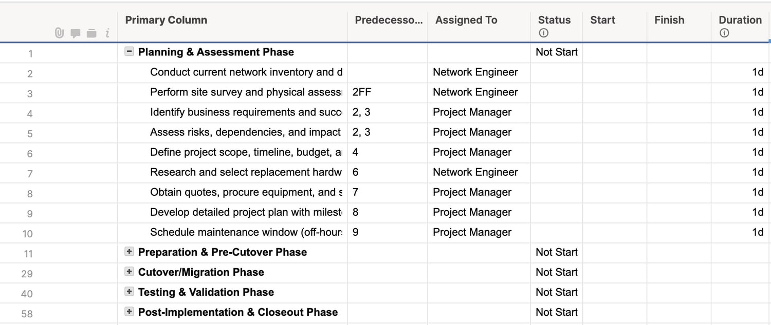 Works in Smartsheet (direct import) or Microsoft Excel. Vendor-agnostic — works for Cisco, Juniper, Arista, or any network equipment.