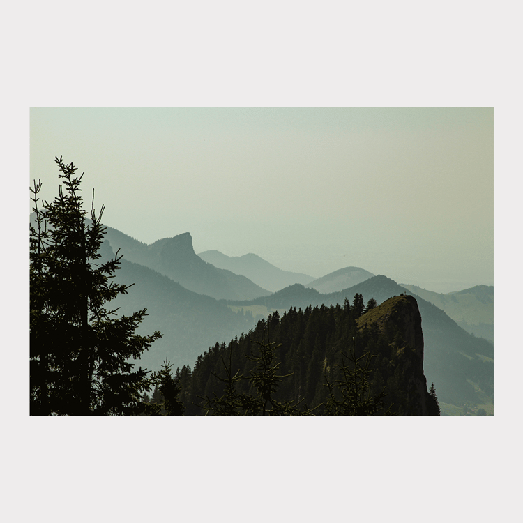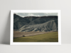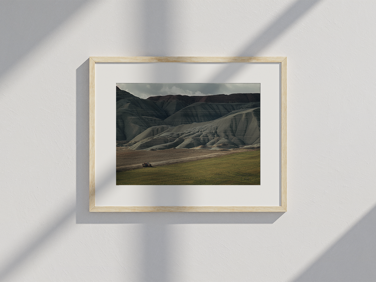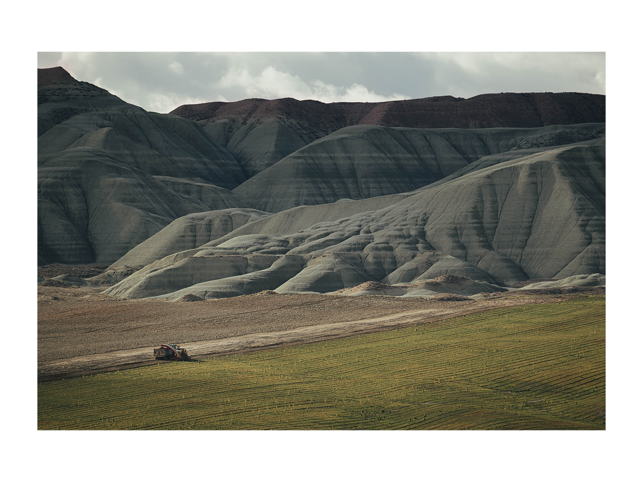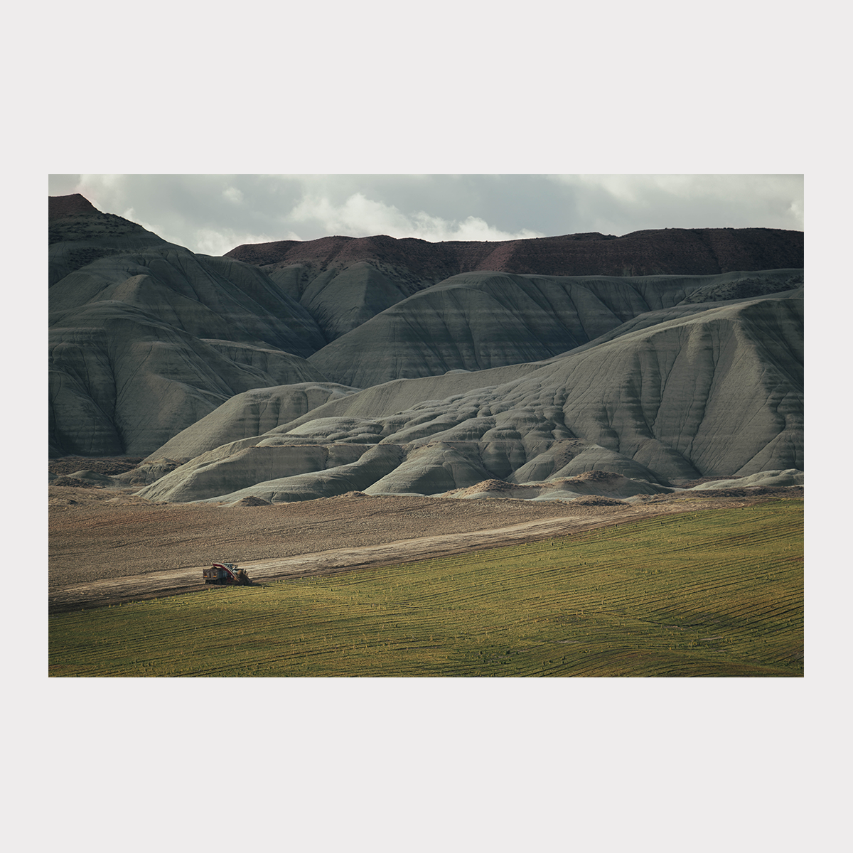 Sur cette image, les montagnes occupent l’arrière-plan, dessinant des lignes minérales faites de nuances de gris. À leurs pieds s’étend un champ plat, partagé en deux couleurs. À droite, une partie encore verdoyante, ponctuée de touches brunes et jaunes ; à gauche, une terre plus sombre, fraîchement travaillée. Un tracteur progresse au centre de cette frontière, comme s’il transformait peu à peu la couleur du sol, traçant une ligne perpendiculaire à celles des strates rocheuses.