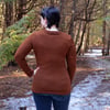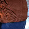 • The cable details travel diagonally across the front of the sweater from left to right, and then back to the left. The Lower Cable begins above the hem at the left hip and ends at the right underarm. The Upper Cable is then formed at the left edge of the lower cable and travels just above the bust shaping to the top of the left shoulder. The pattern includes waist shaping. If customizing the waist shaping and/ or length of the garment, it may impact the final placement of the design element. For this design, the easiest way to adjust the length is to increase or decrease the ribbed hem length.