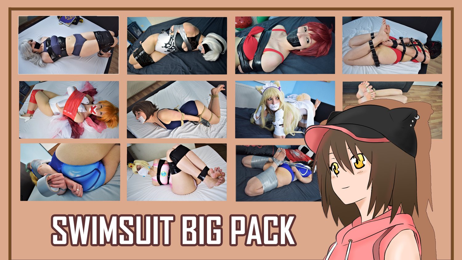 Picset includes: Lots of different bindings, gags, Swimsuits, bikinis, struggling, ropes, belts, tapegags, barefeet and more!!!