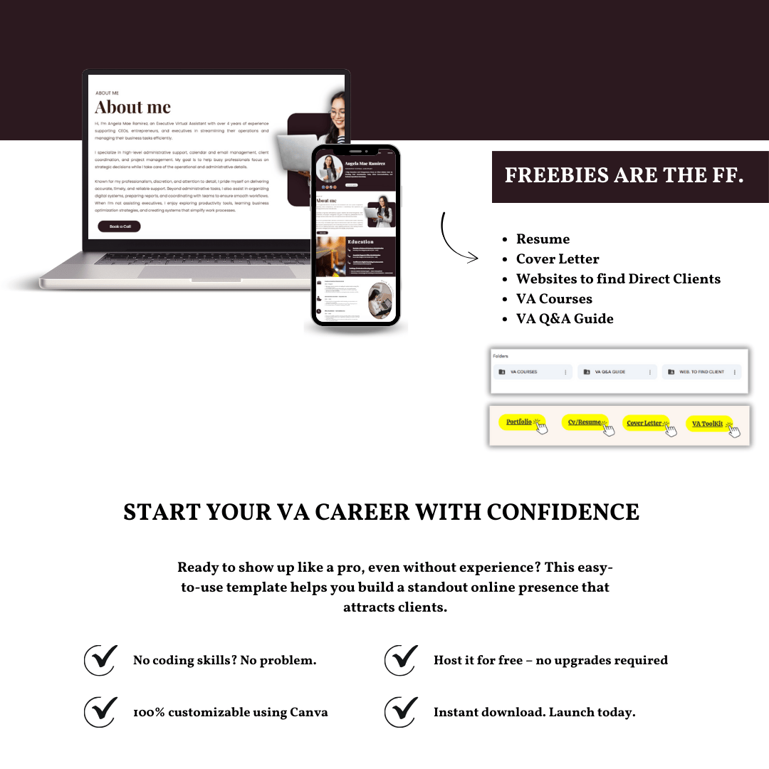 - FREE: Resume, Cover Letter, Websites to find Direct Clients, VA Courses, and VA Q&A Guide.