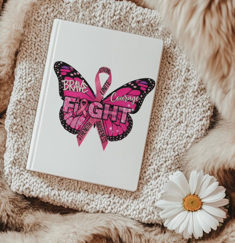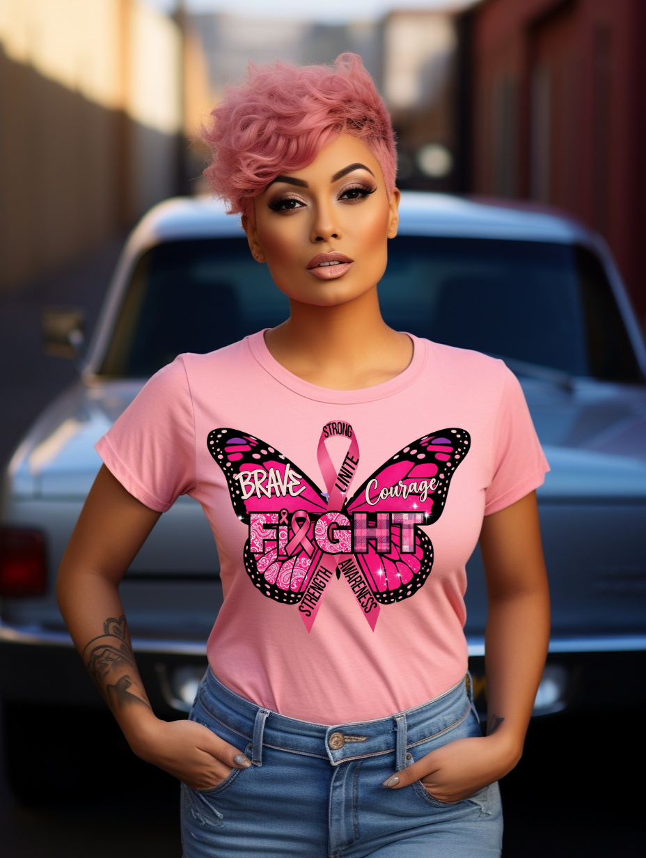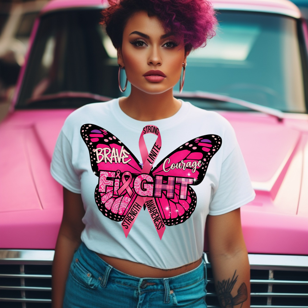Empower and inspire with this Fight breast cancer awareness design featuring a stunning pink butterfly with bandana and plaid patterns, wrapped in a pink ribbon. Accented with powerful words like Brave, Courage, Strength, Unite, and Awareness, this design is a beautiful tribute to survivors, fighters, and supporters.