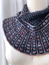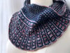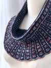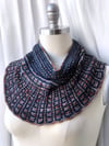 The upper section is a simple polka dot mosaic pattern, followed by a band of larger mosaic blocks. The lower section is separated into polka dots in the back with the bejeweled bib in the front. Increases are worked into the bib portion, so the jewels get larger as you work downward, which gives the cowl its flared shape.