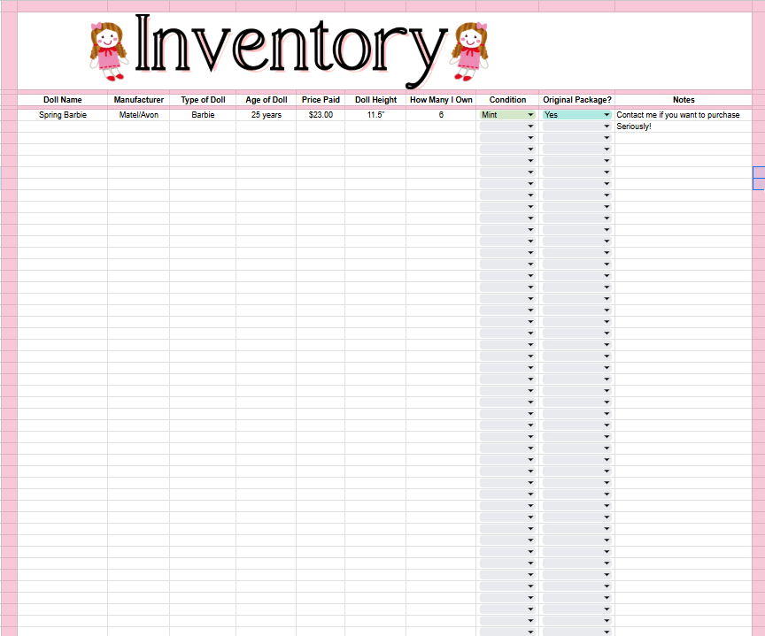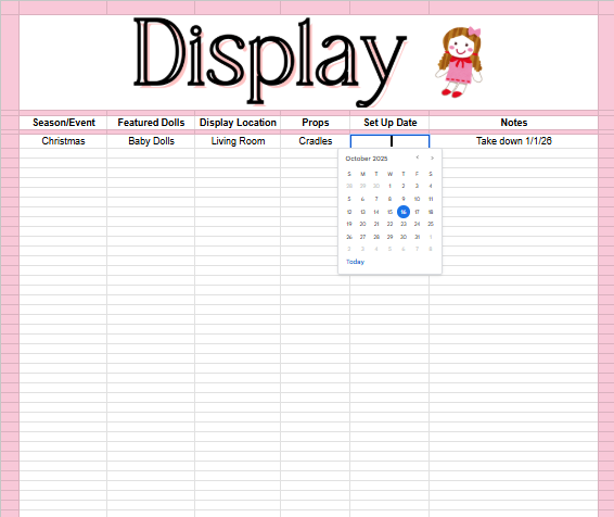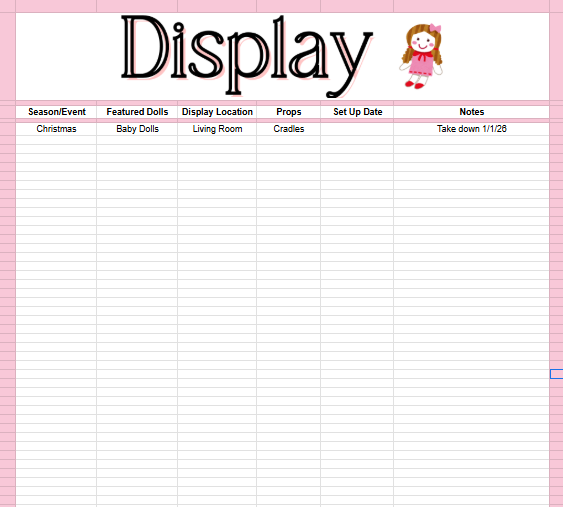 Easy-to-Read, Doll Collecting Inventory Tracker - Google Spreadsheet – Large Print Format
