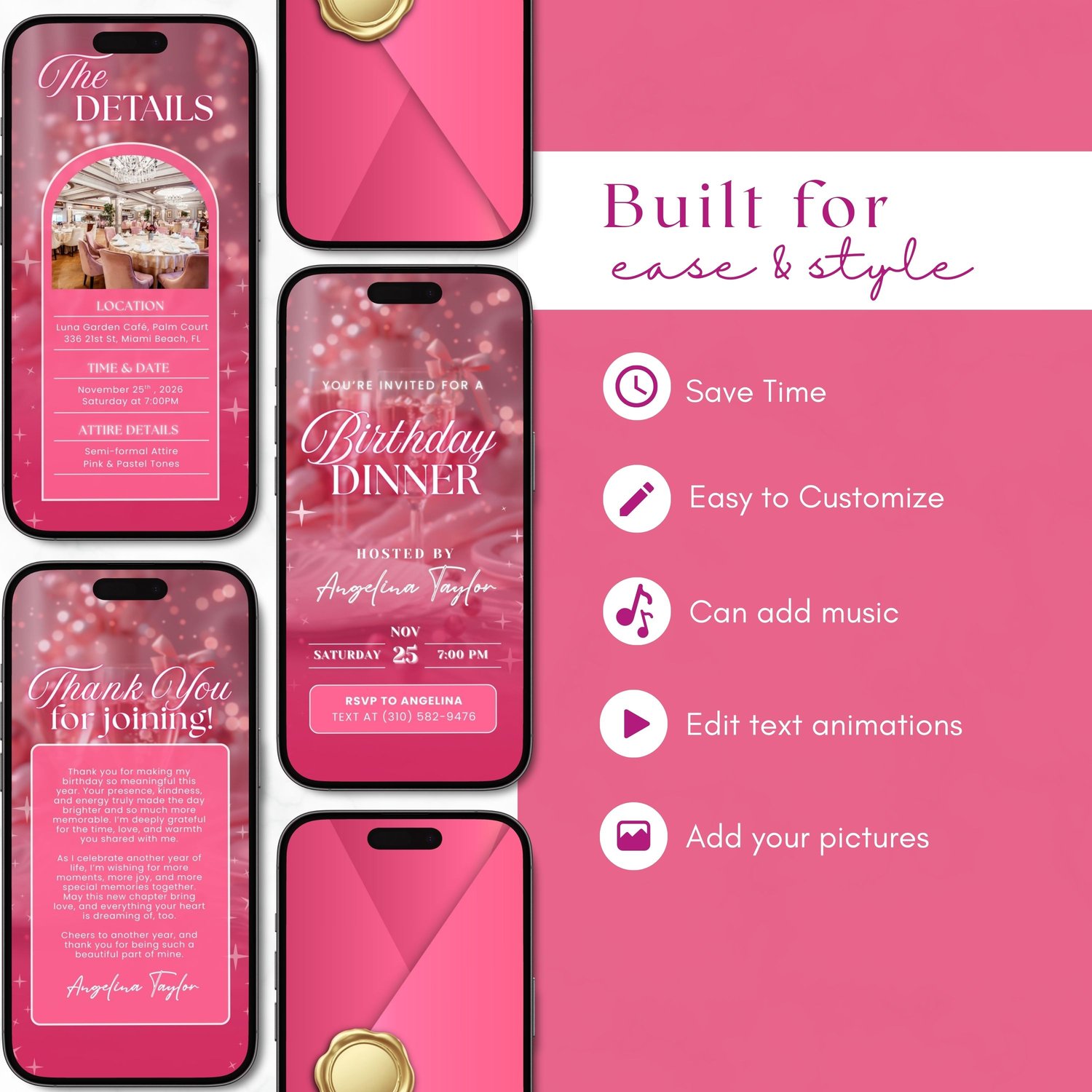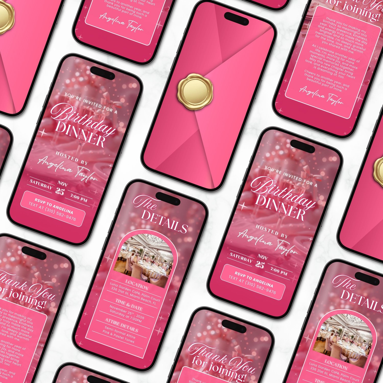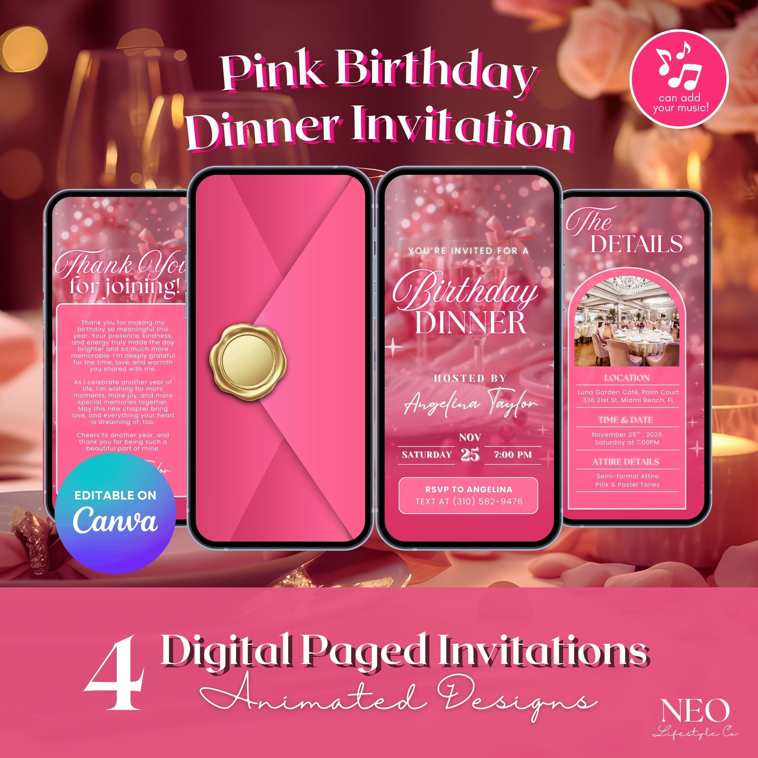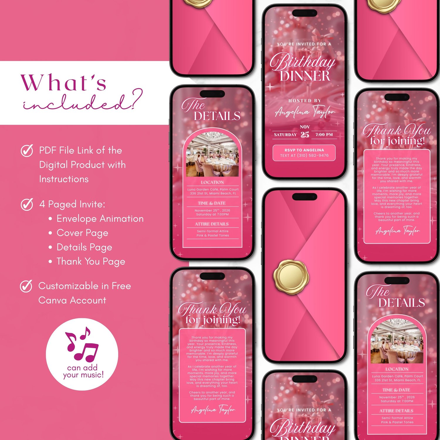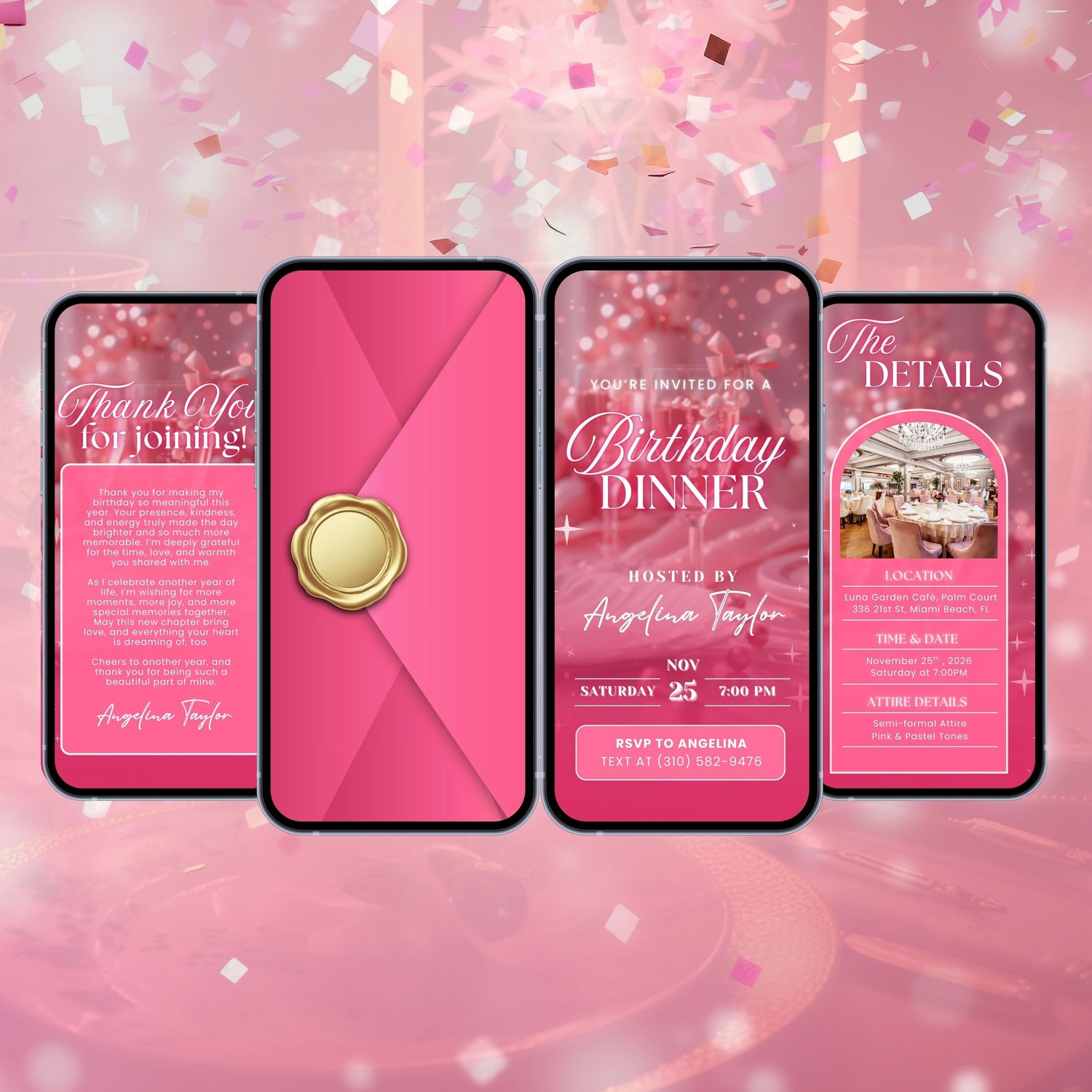 ๐ Pink Birthday Dinner Invitation, Luxury Bday Party Invite for Elegant Women (Aesthetic Animated Canva Template Video Evite w/ Envelope) | 4 Editable Mobile Canva Pages ๐
