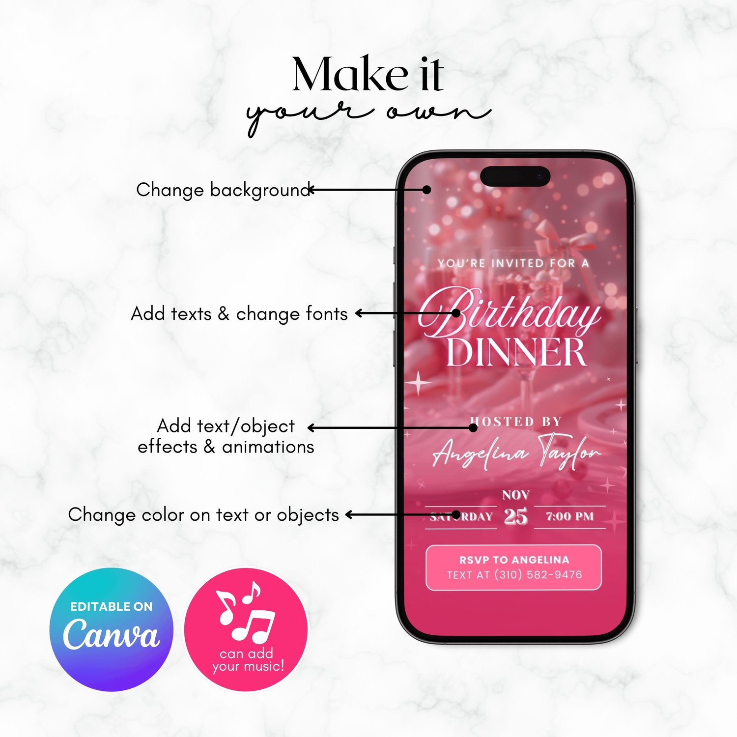 Customize your text, fonts, colors, and animations directly in Canva (FREE or Pro) โ no extra software needed. Download and send your invitation instantly via text, email, or social media.