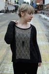 A boxy sweater with long sleeves and a contrast color lace panel in the front.