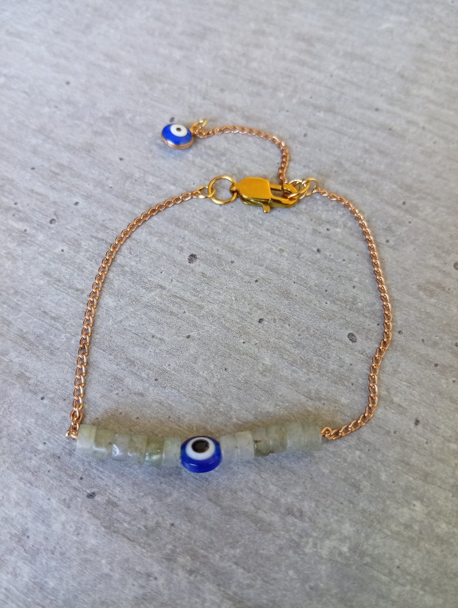 Bracelet en labradorite monté sur chaîne dorée, orné d’un petit œil turc délicatement intégré entre les perles. Une pièce qui allie protection énergétique et élégance discrète, pensée pour veiller tout en sublimant.