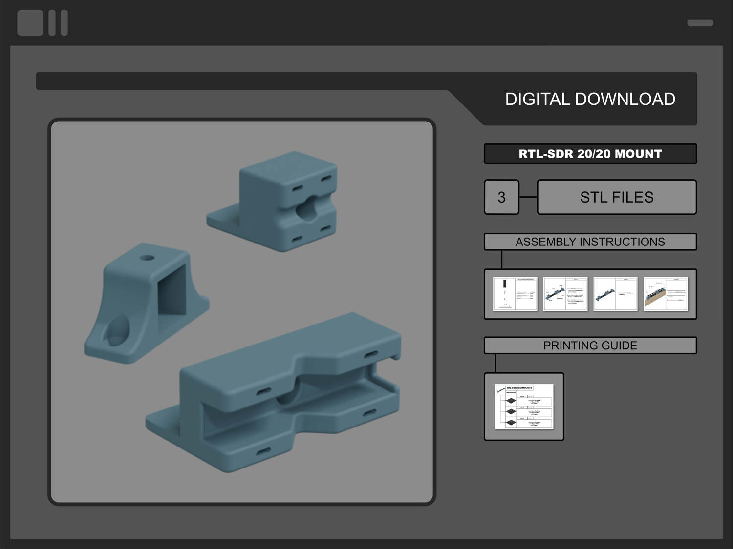 These mounts are designed to securely fasten your RTL-SDR device and cables using 20/20 extrusions. Each mount features integrated zip tie channels, allowing you to easily secure your antenna or USB cables. These mounts offer additional support to the SMA and USB connections on the RTL-SDR device, particularly beneficial when using higher quality cables. Lastly, a dedicated mount is included for using #8 wood screws to attach the assembly to any surface.
