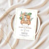 This adorable kids birthday invitation features a fun-filled safari scene with a car packed full of cheerful safari animals on their way to the ultimate celebration. Leading the way is a wooden sign that reads “Calling all party animals” to encourage others to join in the fun. It sets the perfect tone for a playful and unforgettable party.