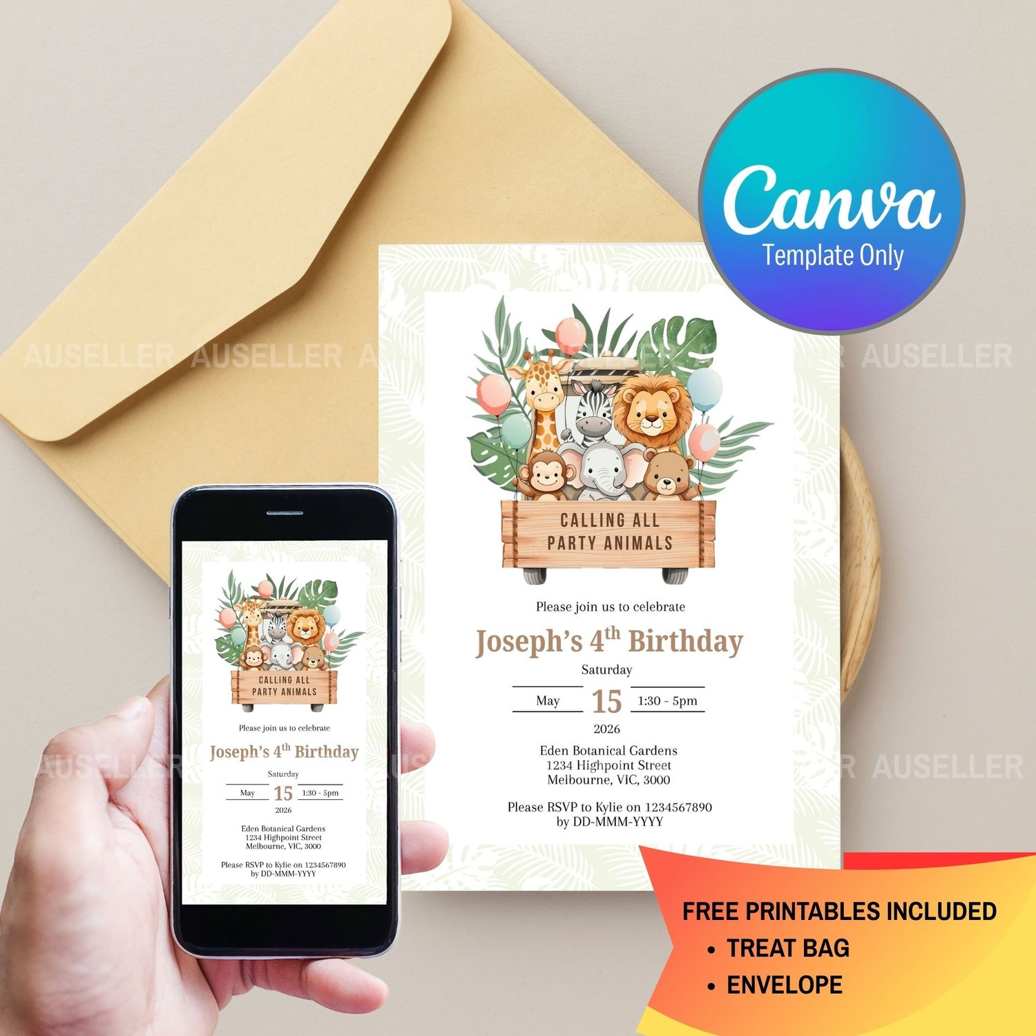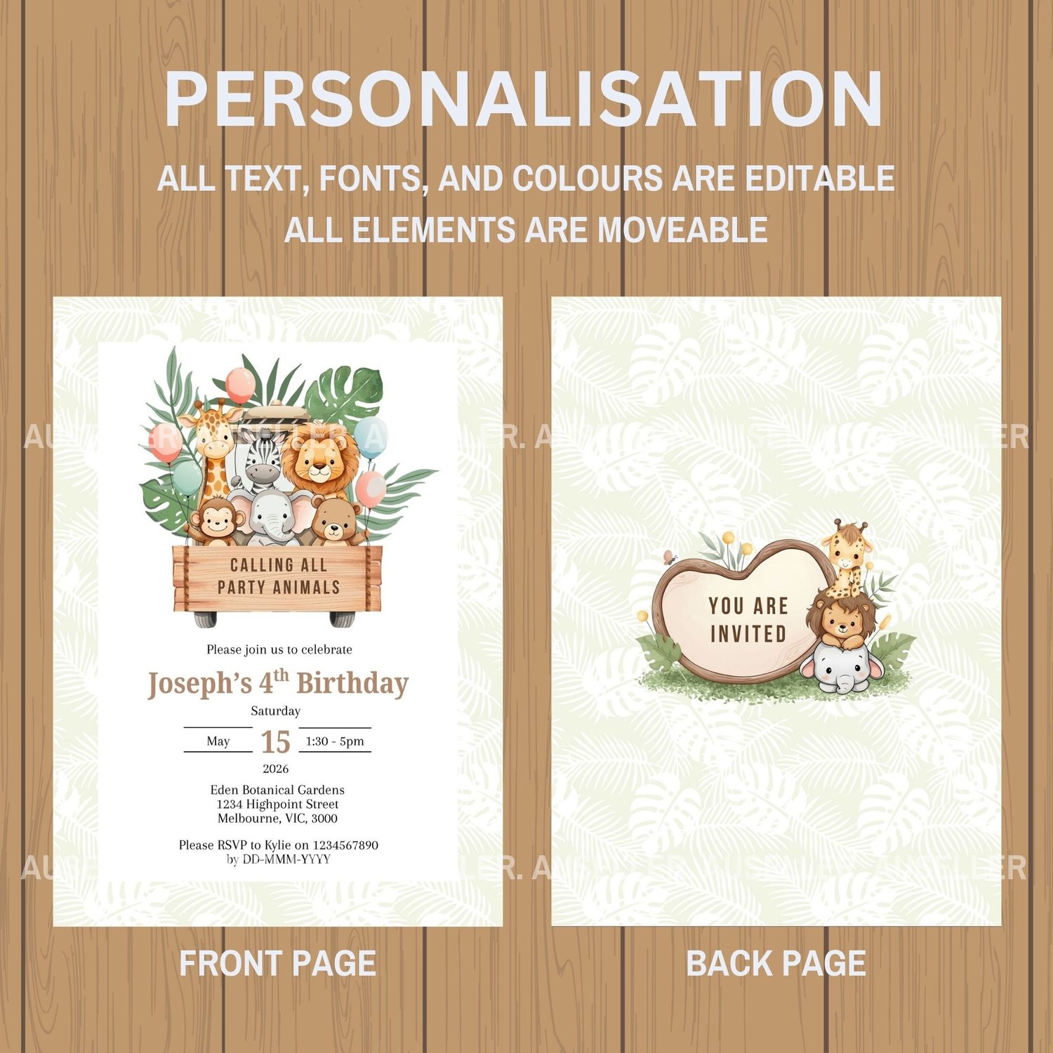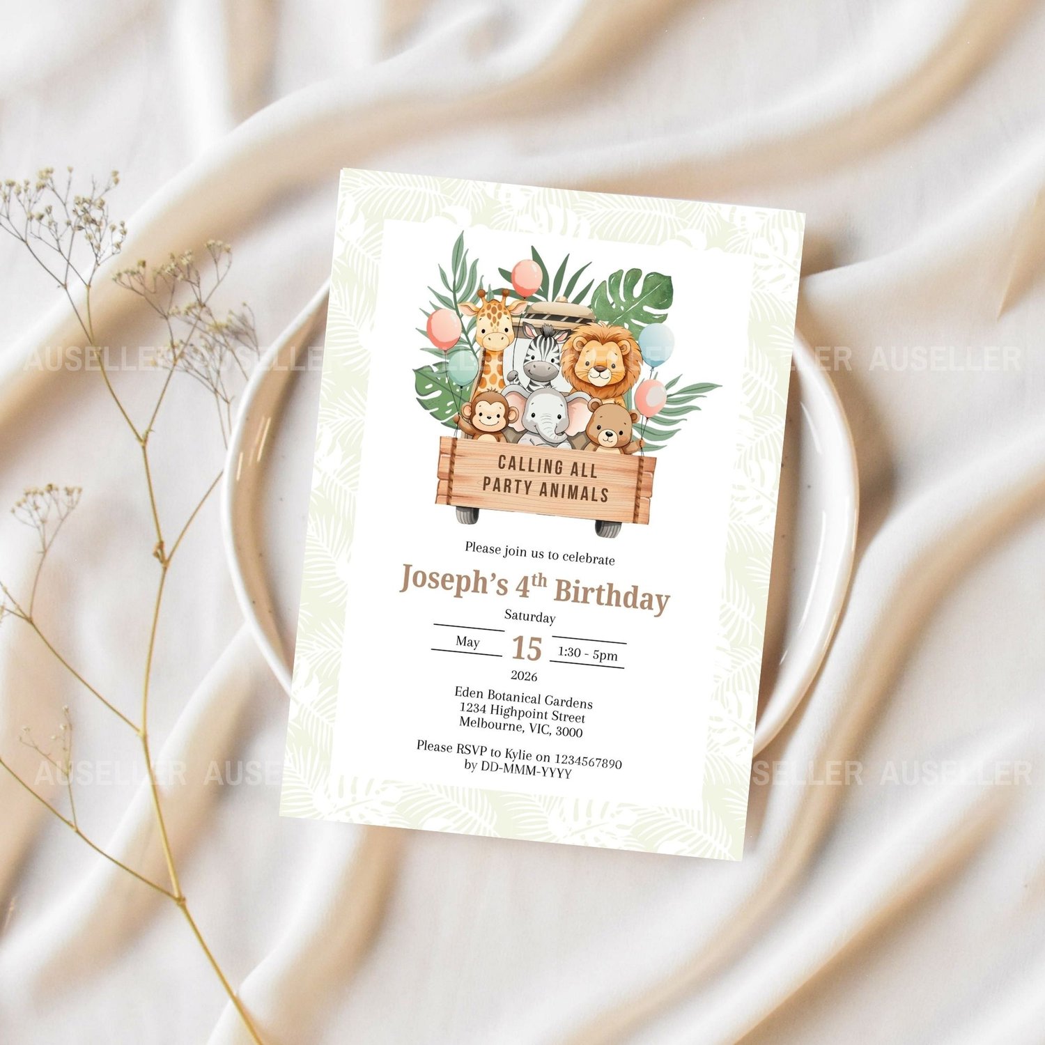 Perfect for safari-themed birthdays, this invitation is ideal for little adventurers who love animals, excitement, and a touch of wild fun.