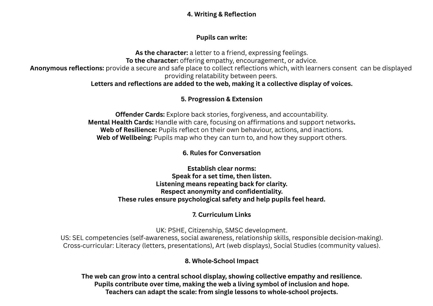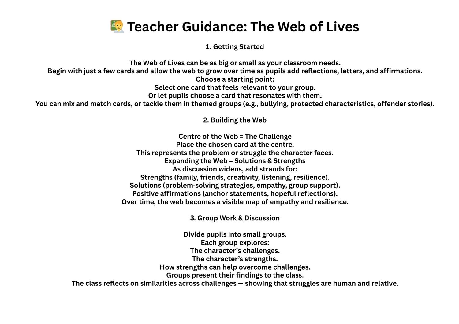 Each lesson is built using the Web of Lives™ system — an interconnected set of card‑based activities that explore identity, diversity, bullying, relationships, resilience, accountability and change.