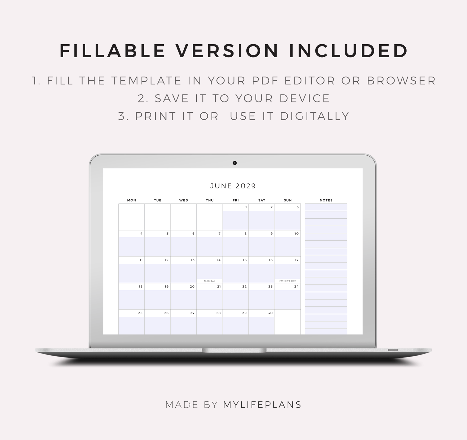 2029 Monthly Calendar with Holidays & Notes, Printable & Fillable, A4/Letter Size, Landscape